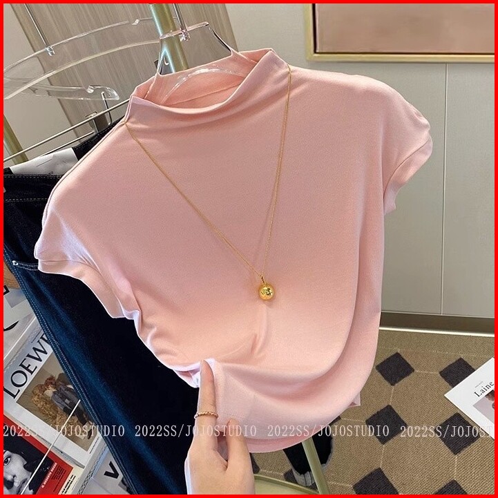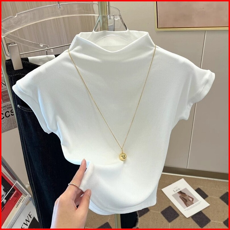 Kaos Turtleneck Berusuk Atasan Ramping Lengan Pendek Cokelat Wanita