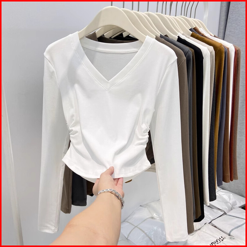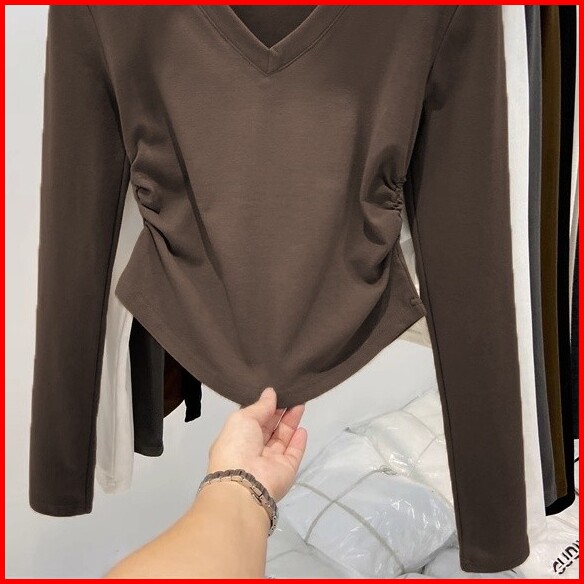 Kaos Lengan Panjang Kerah V Cokelat Atasan Potong Wanita Kualitas Tinggi