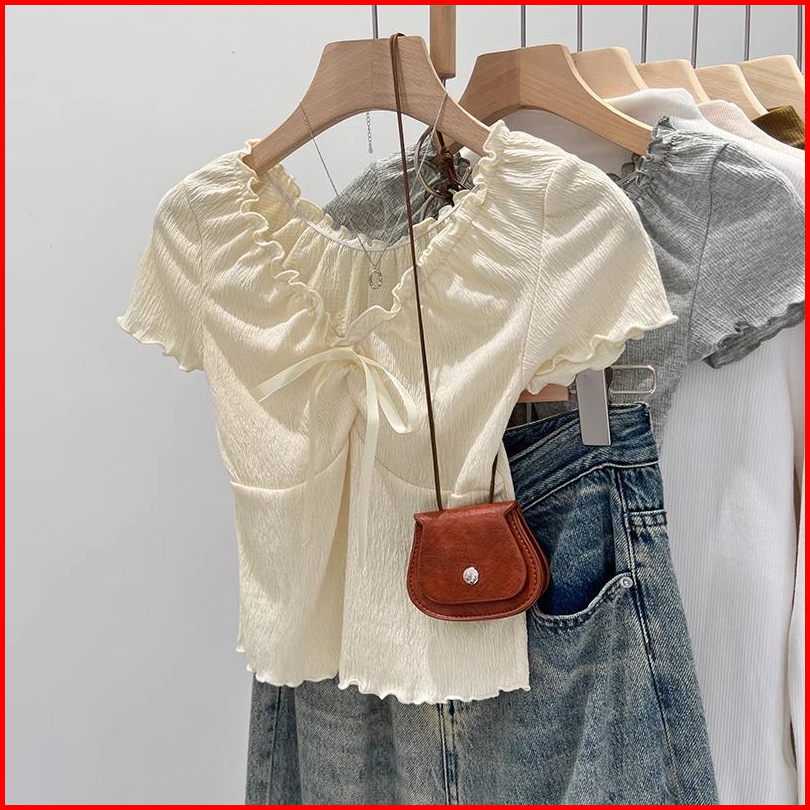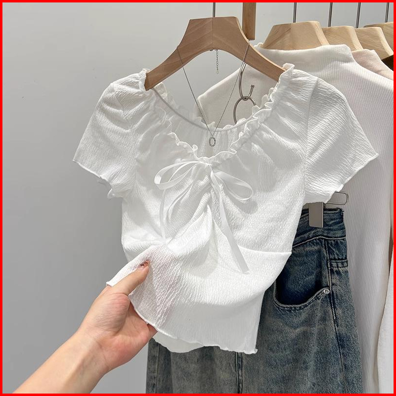 T-shirt Lengan Pendek Kerah V Bertali Putih
