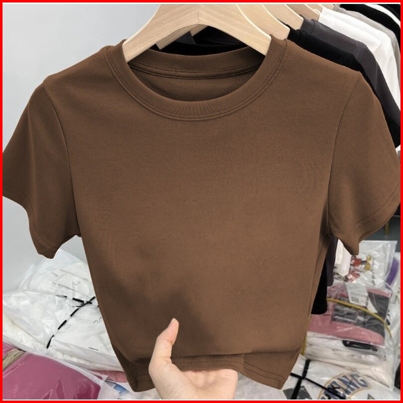 T-shirt Melar Ramping Leher Bulat Pendek Coklat T-shirt Coklat T-shirt Gaya Korea