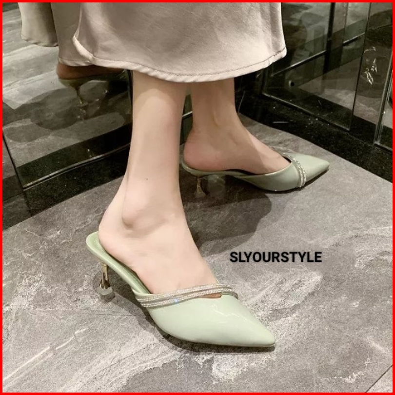 Sandal Wanita Heels Hak Kerucut Bahan Glossy Selop Bapau Lancip Strip Glitter Terbaru Dan Terlaris Termurah Variasi Muti