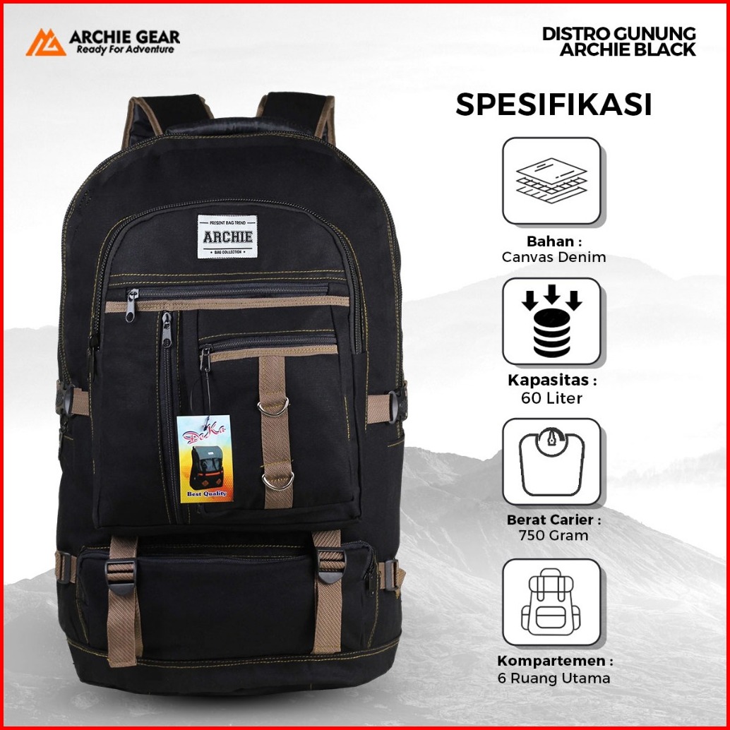 Archie Gear - Ransel Tas Gunung Carrier Archie Distro Hitam Outdoor Traveling Mudik Jalan