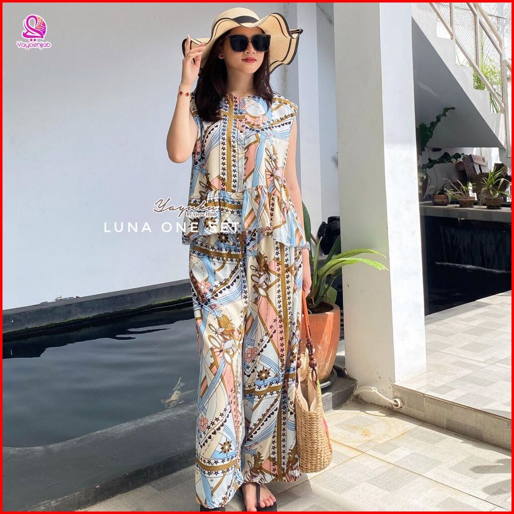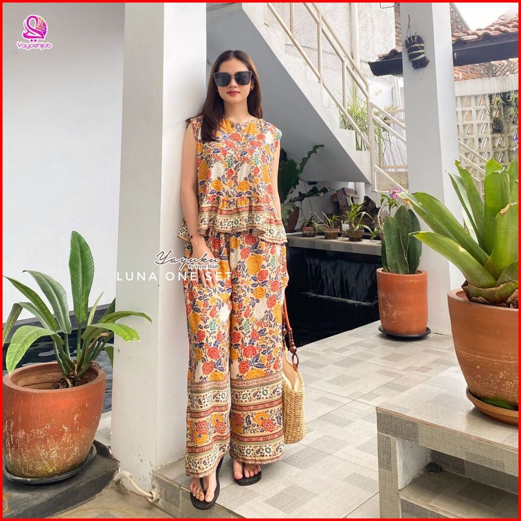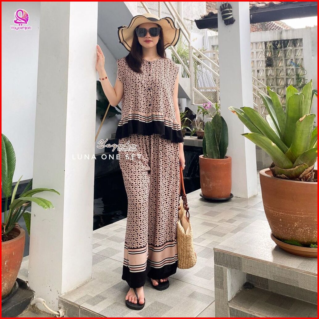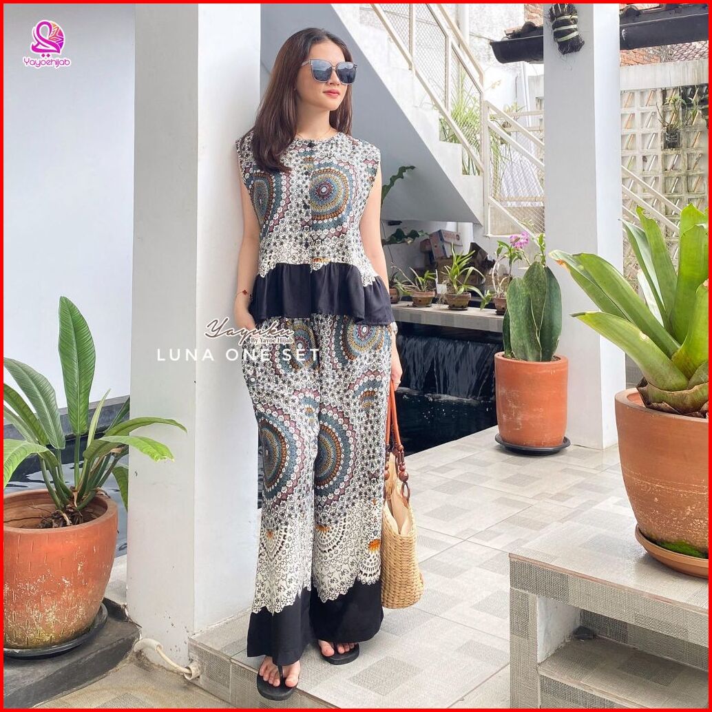 Luna One Set Celana Kulot Panjang Rayon Motif Premium Baju Dewasa Wanita Adem Busui Friendly Yayuku