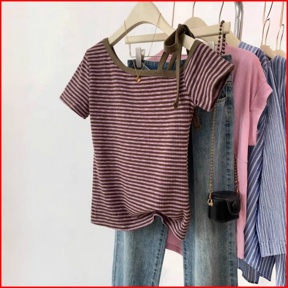 Kaos Bergaris Lengan Panjang Dengan Desain Dasi Off-shoulder Warna Ungu