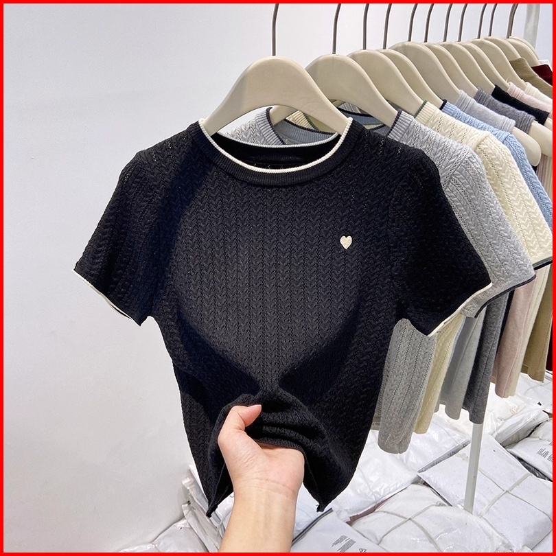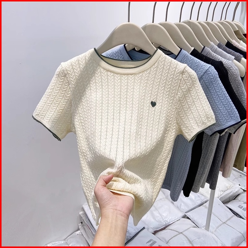 Kaos Oblong Rajut Bergaris Lengan Pendek Motif Blue Dengan Leher Bulat Dan Sulaman Hati