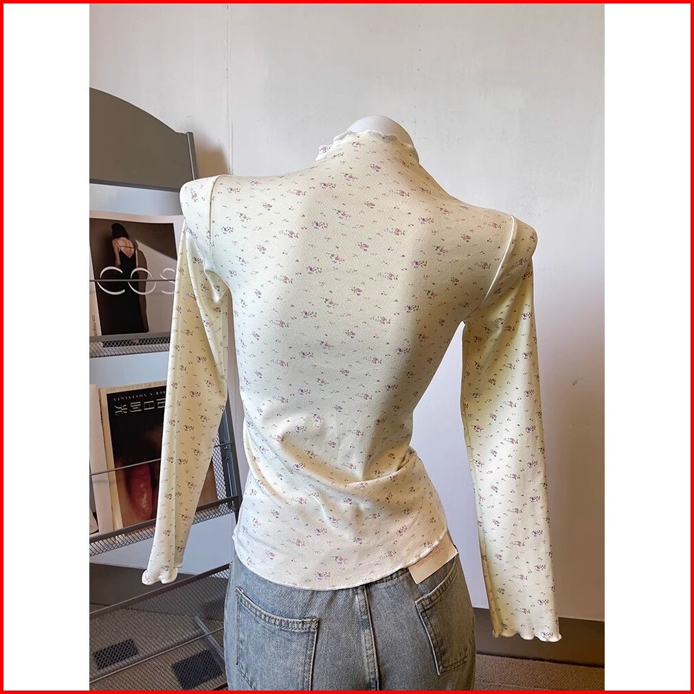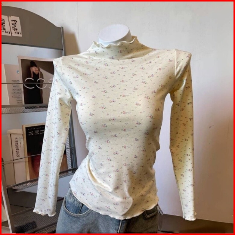Kaos Bermotif Bunga Lengan Panjang Setengah Turtleneck
