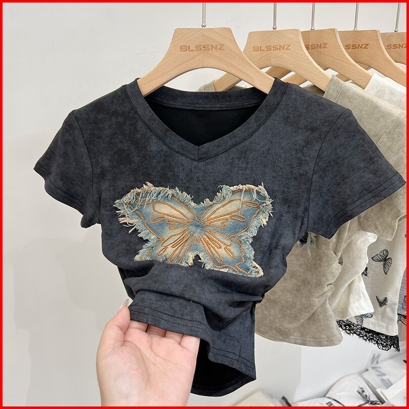 Kaos Motif Kupu-kupu Lengan Pendek Leher V Hitam