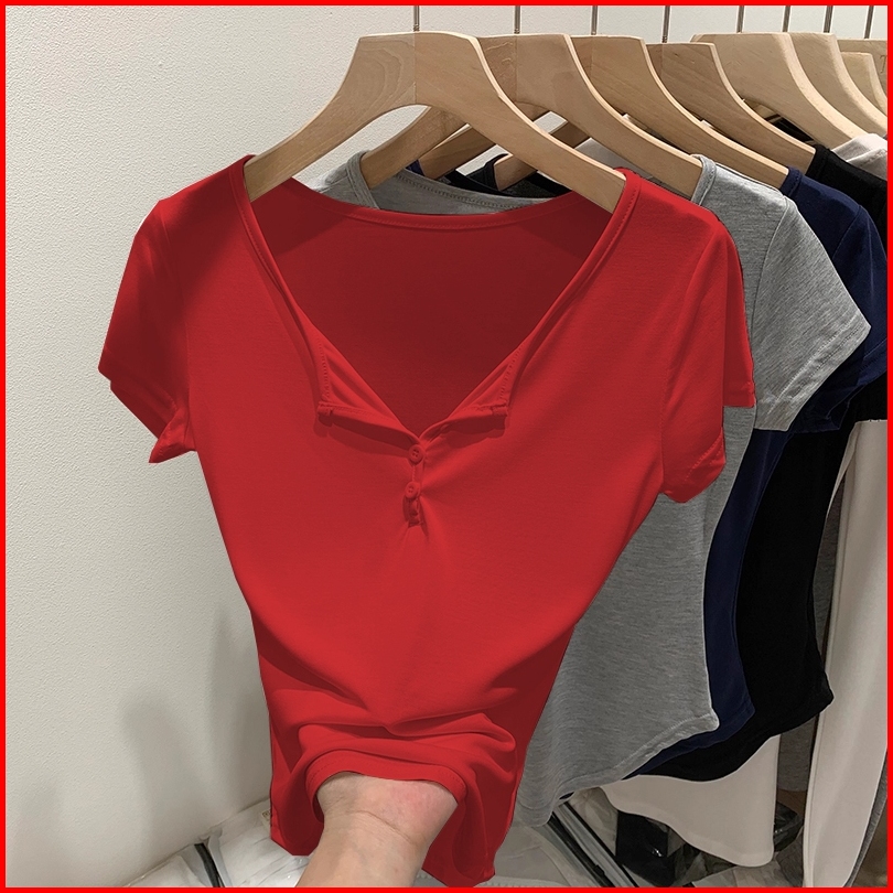 T-shirt Melar Dengan Kancing Berbentuk U-neck Dongdaemun Korea Selatan Elastis Tinggi 4 Size S M L Xl