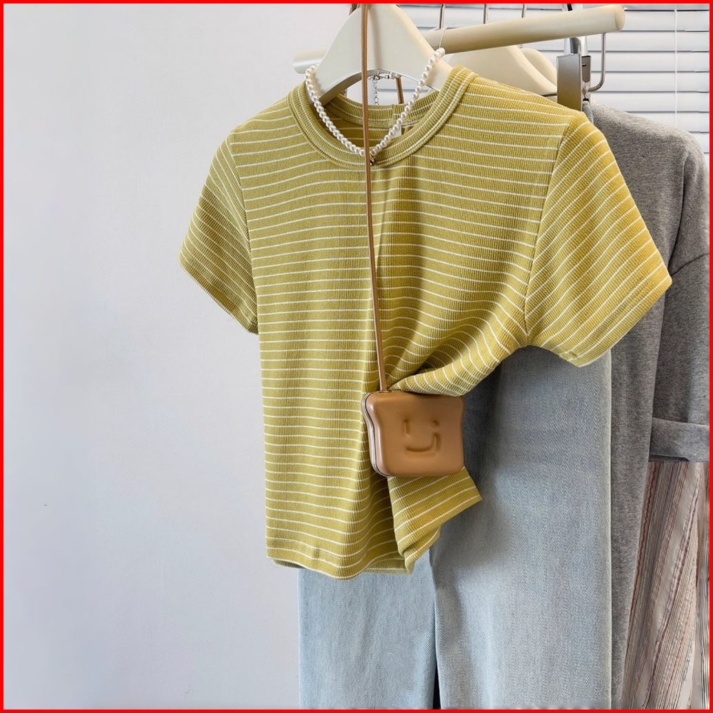 Kaos Leher Bulat Bergaris Hijau Berkualitas Tinggi Untuk Wanita Atasan Bergaris Pendek Warna Solid Elastis Tebal Ukuran