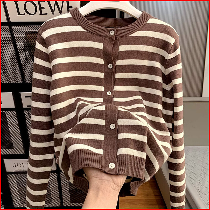 Atasan Kardigan Rajutan Garis-garis Lengan Panjang Berwarna Cokelat