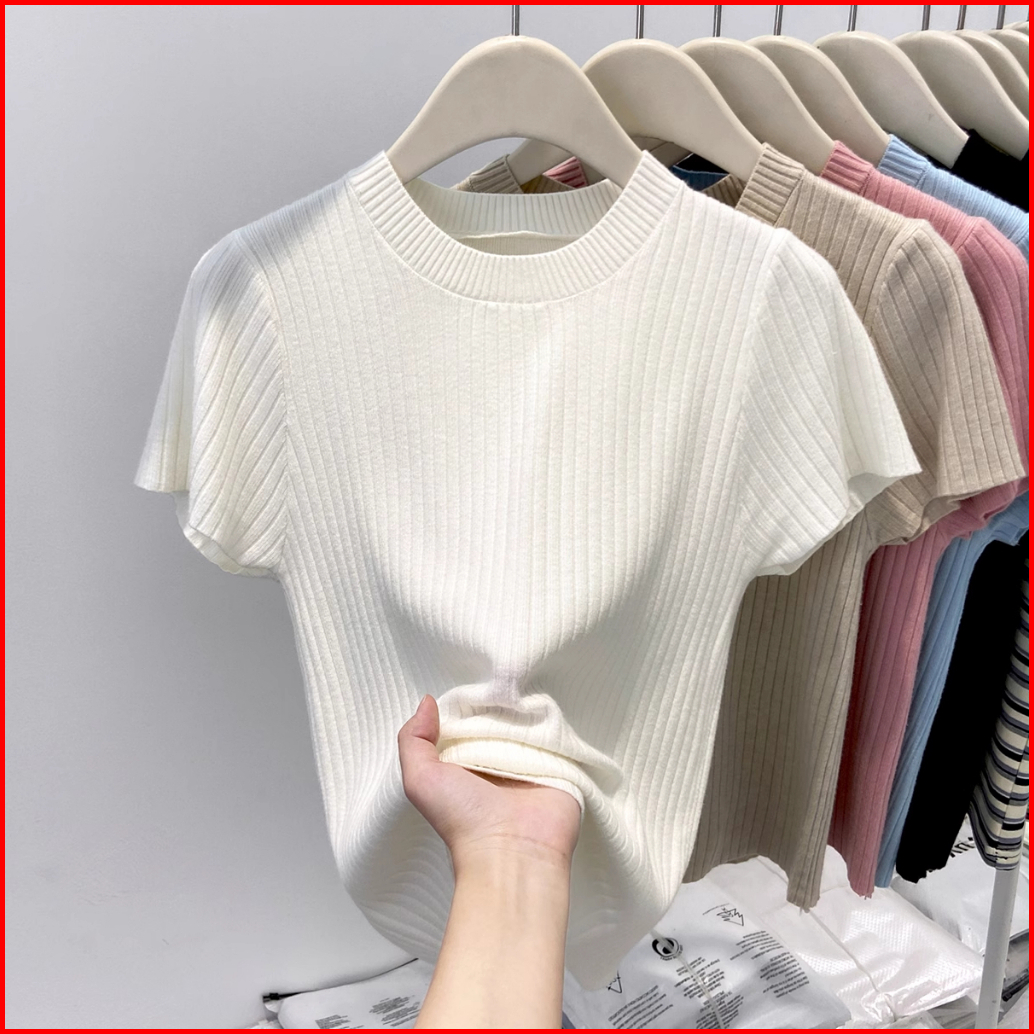 Kaos Lengan Pendek Rajut Bergaris Leher Bulat Warna Khaki