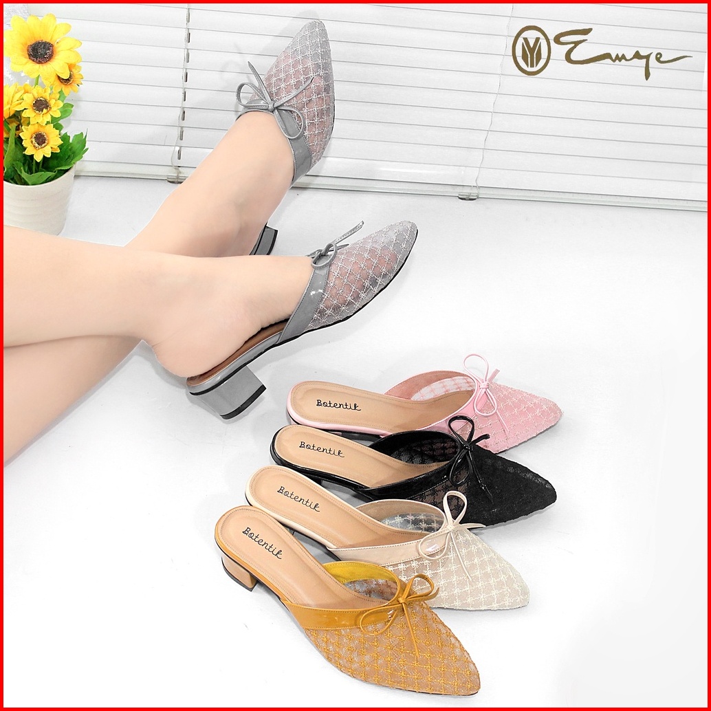 Emye-sepatu Sendal Mules Pesta Kondangan Wanita Hak Tahu 3cm Brukat Jala Transparan