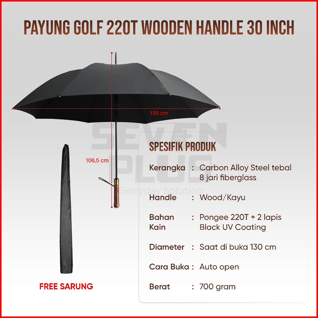 Sevenplus Payung Golf Premium Quality 220t Full Uv Block Wood Handle - Ukuran Diameter Besar 130cm Muat 3-4 Orang Jumbo