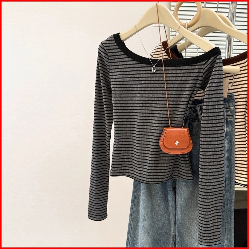 Kaos Bahu Terbuka Lengan Panjang Premium Bergaris Hitam