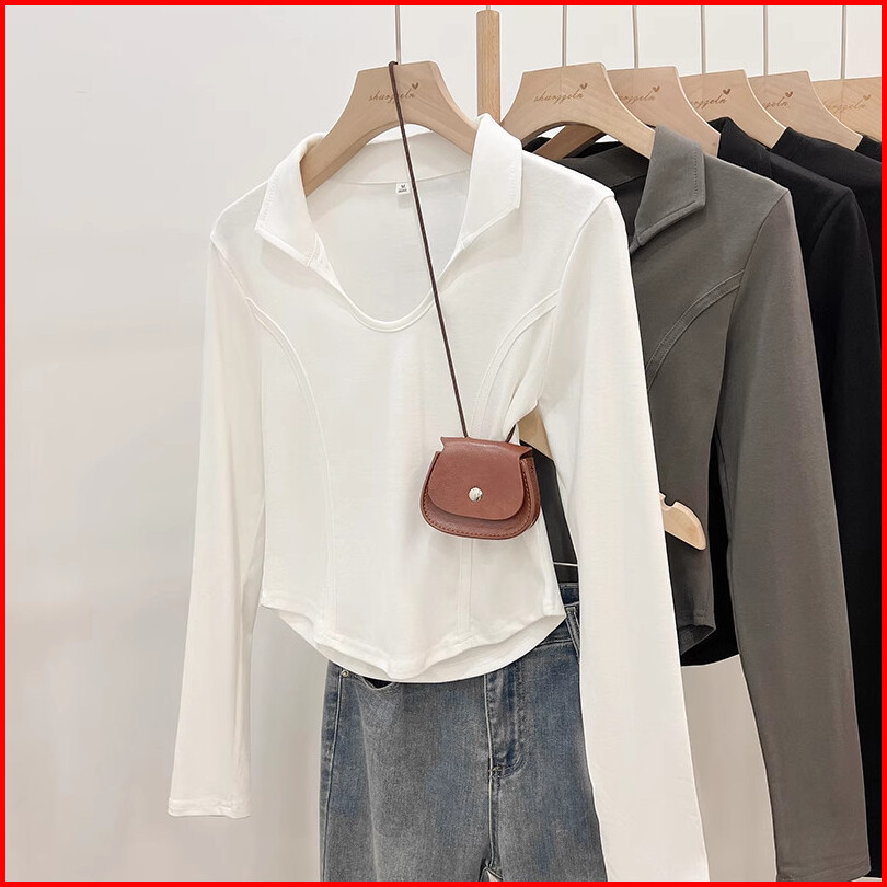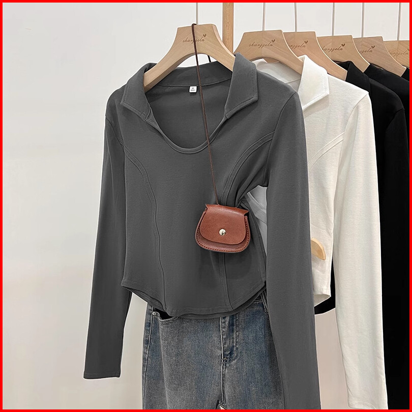 Kaos Wanita Crop Lengan Panjang Kerah Polo Atasan Putih Premium