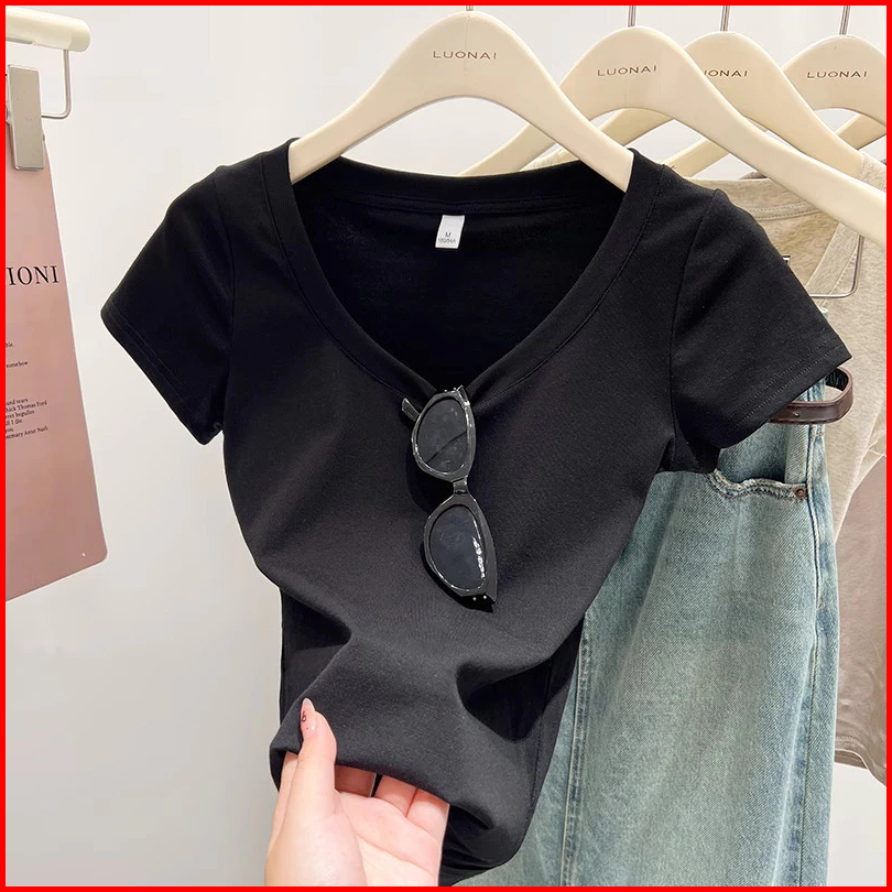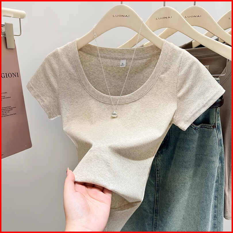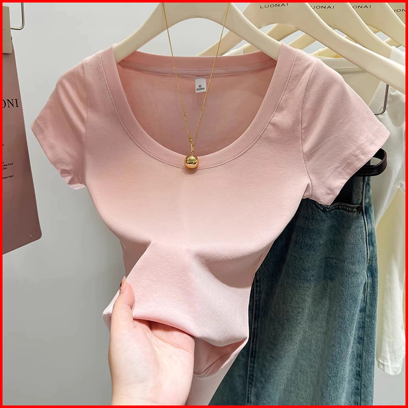 T-shirt Stretch Leher Bulat Berwarna Merah Muda Dongdaemun Korea Selatan