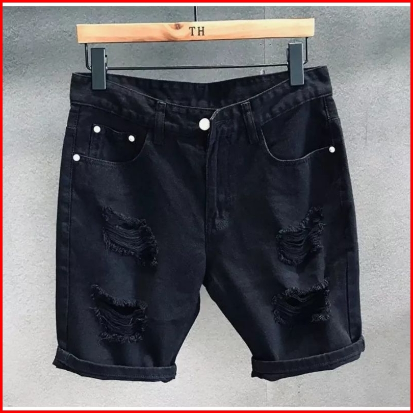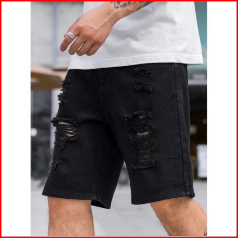 -celana Jeans Pendek Robek-celana Jeans Pria Sobek Hitam