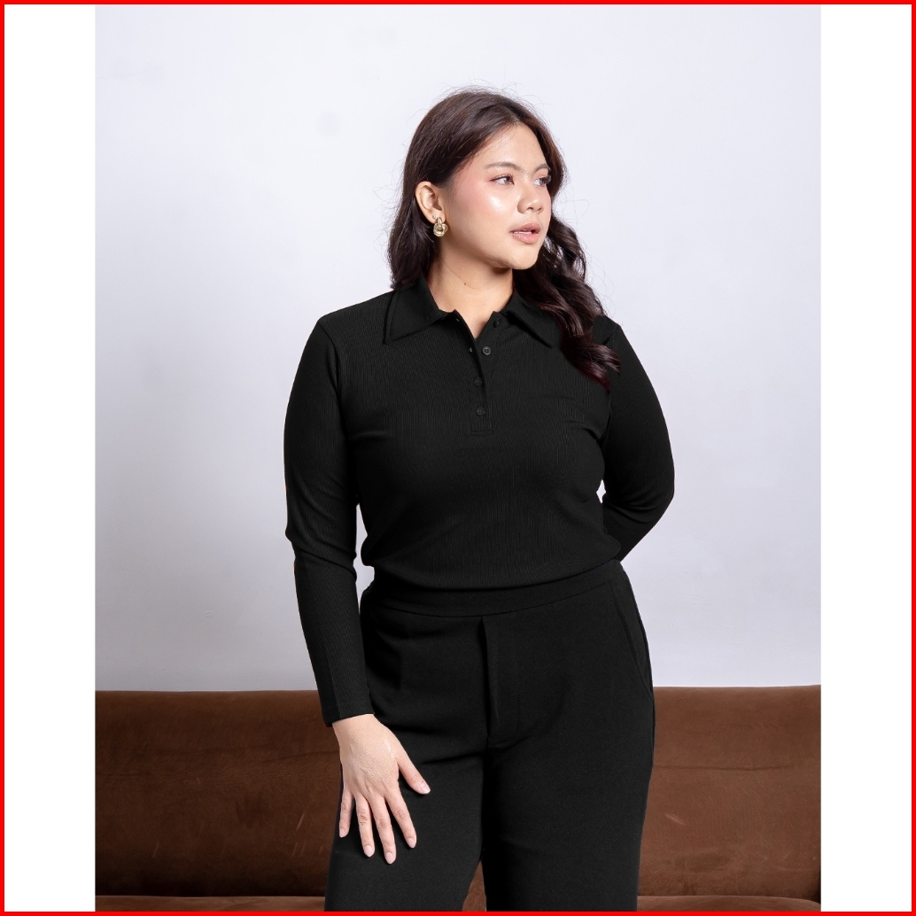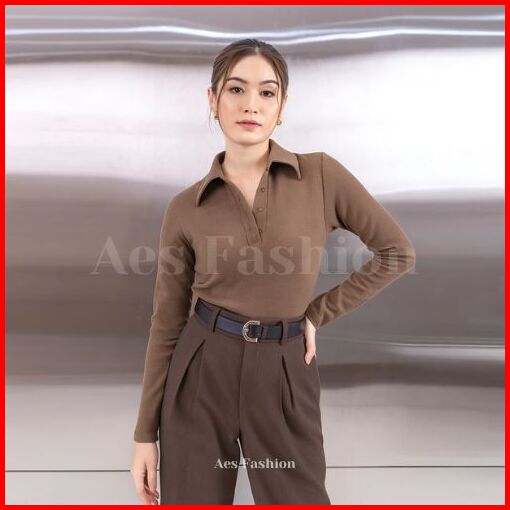 Aes Fashion Hanna Top Atasan Wanita Lengan Panjang Outer Polo Wanita Rib Premium
