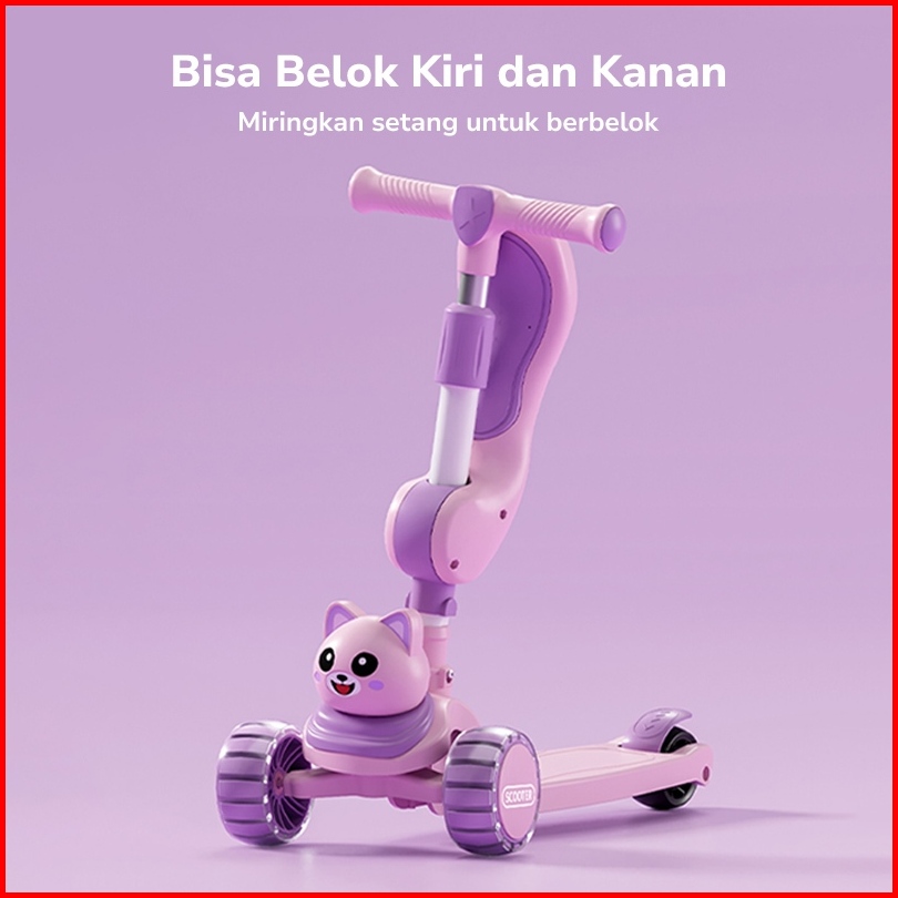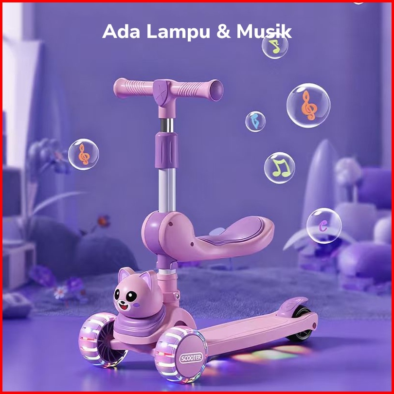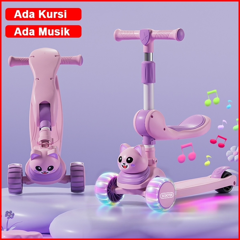 Skuter Anak 3-in-1 Bisa Duduk Atau Naik Scooter Roda 3 Dengan Musik Dan Lampu Mainan Geser Anak Perempuan
