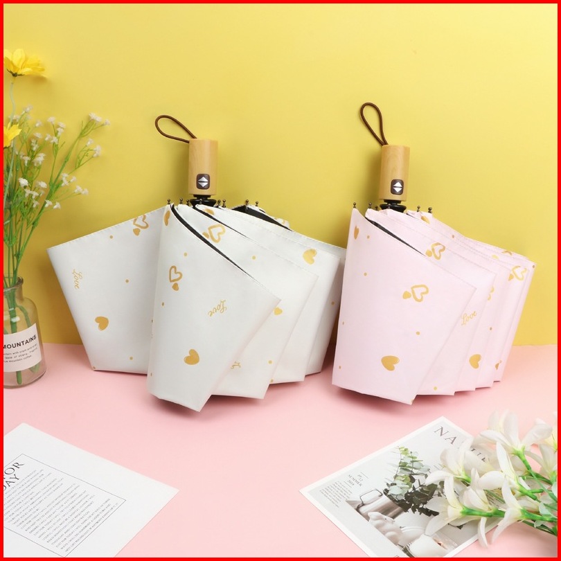 Payung Buka Tutup Otomatis Lipat 3 Double Tulang Motif Love Gagang Kayu Kokoh Premium