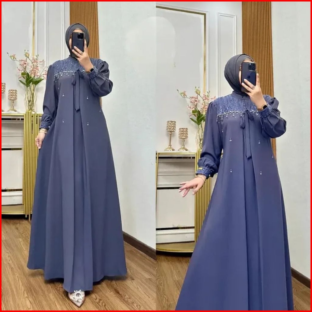 Terbaru Rania Dress Gamis Kondagan Mewah Bahan Ceruty Babydoll Mix Brukat Aplikasi Payet Mutiara