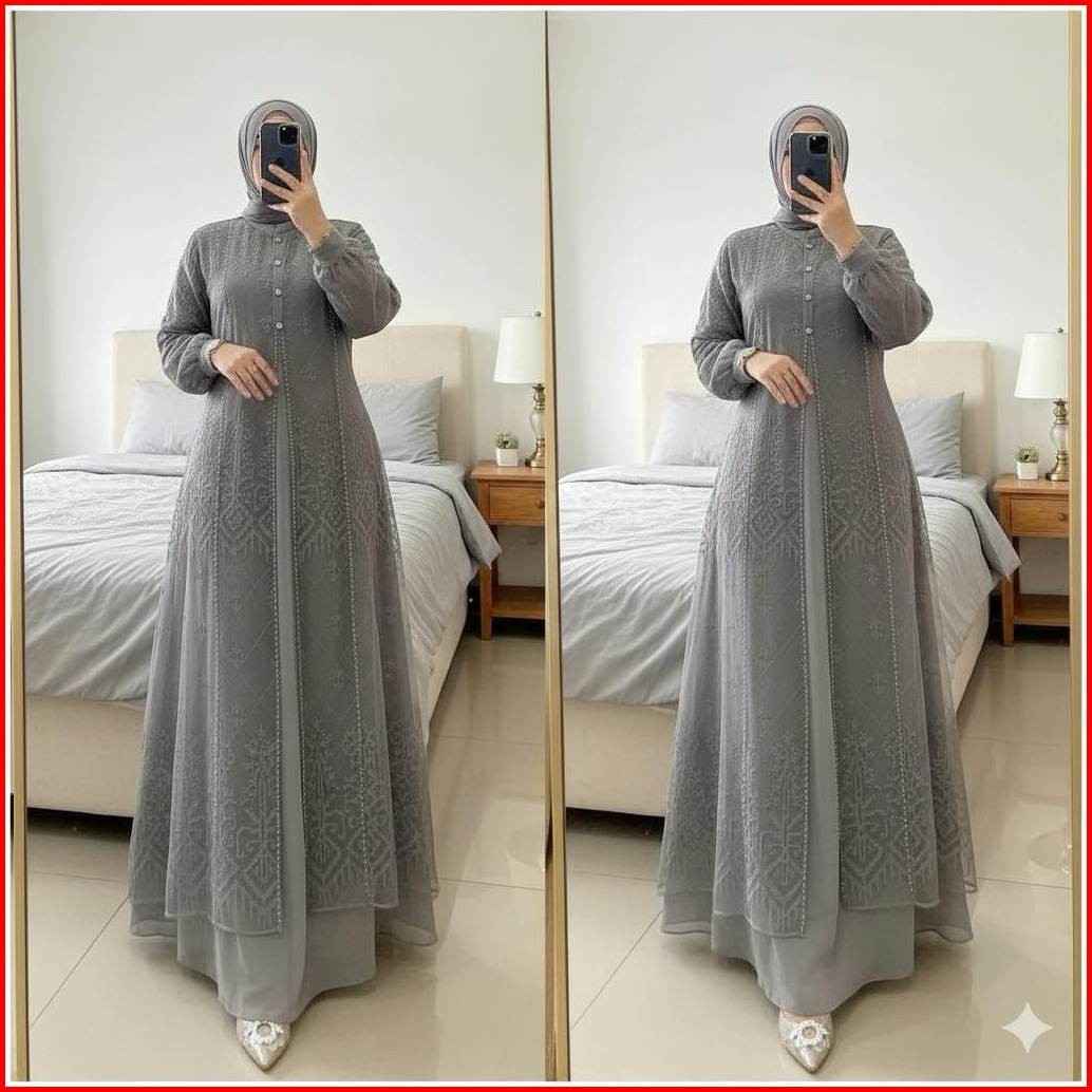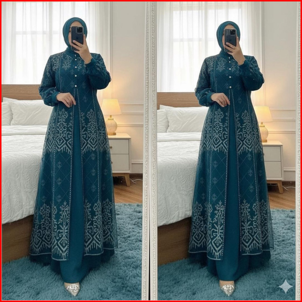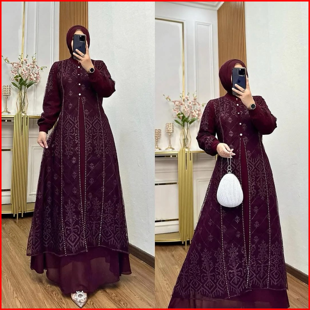 Denara Dress Gamis Muslim Brukat Mewah Bahan Ceruty Babydoll Full Puring Aplikasi Swaroski