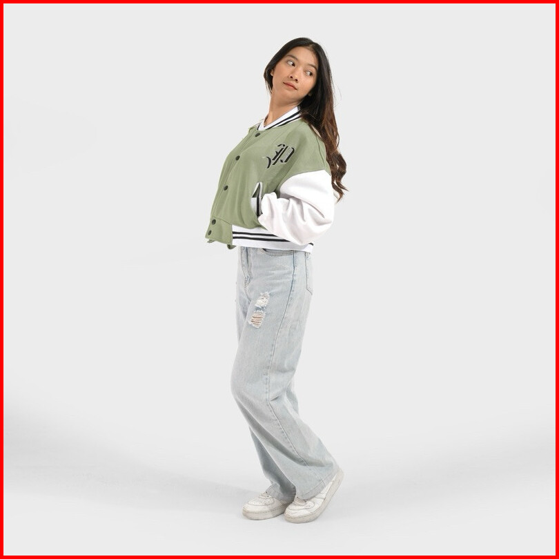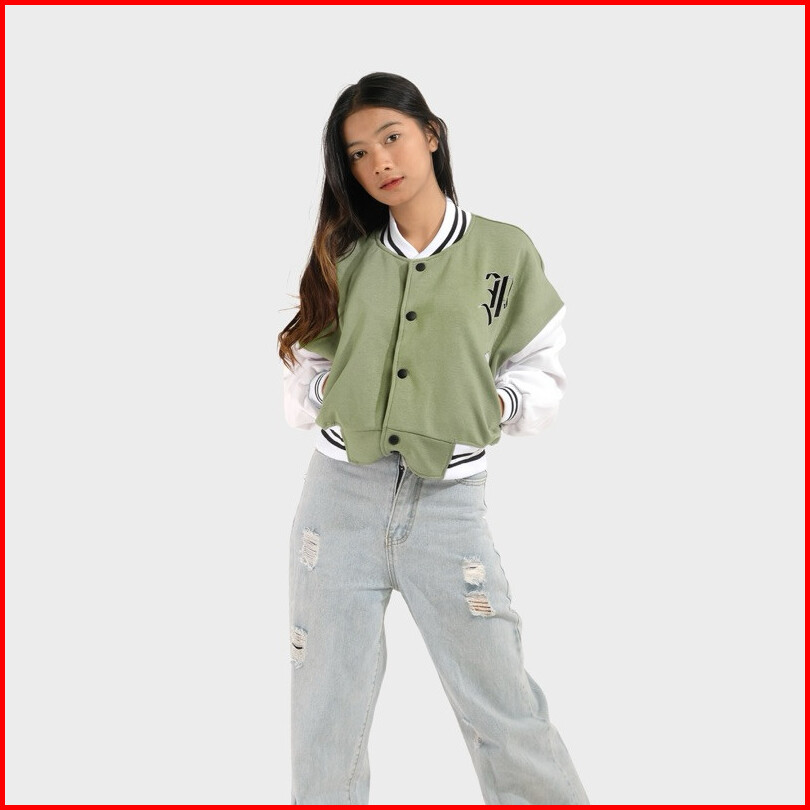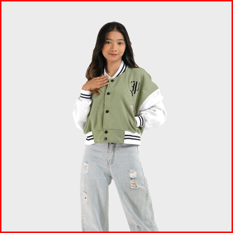 Phompphiess Jaket Varsity Crop Oversize Jacket Baseball Sage Putih