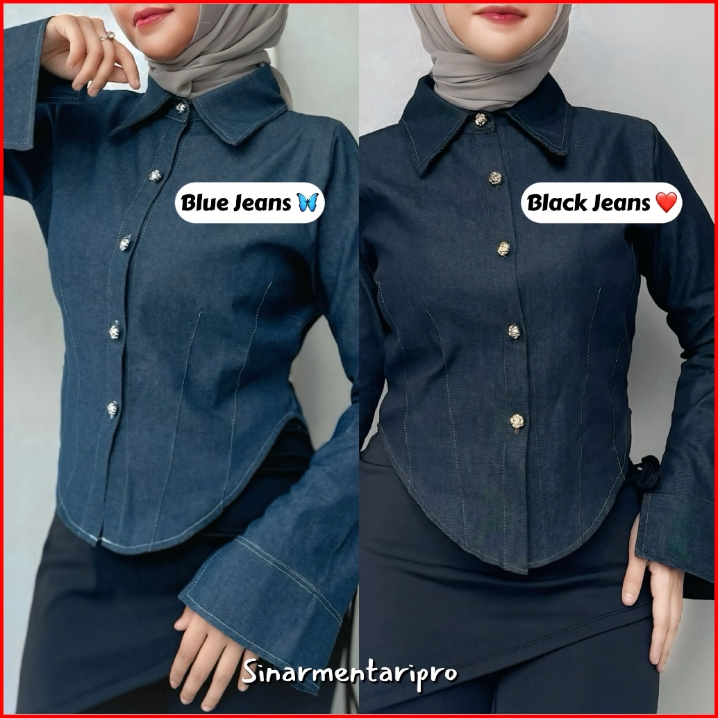 Smpro - Jeans Baju Kemeja Oval Jeans Kancing Bunga Baju Atasan Wanita Jeans Tebal Tangan Panjang -