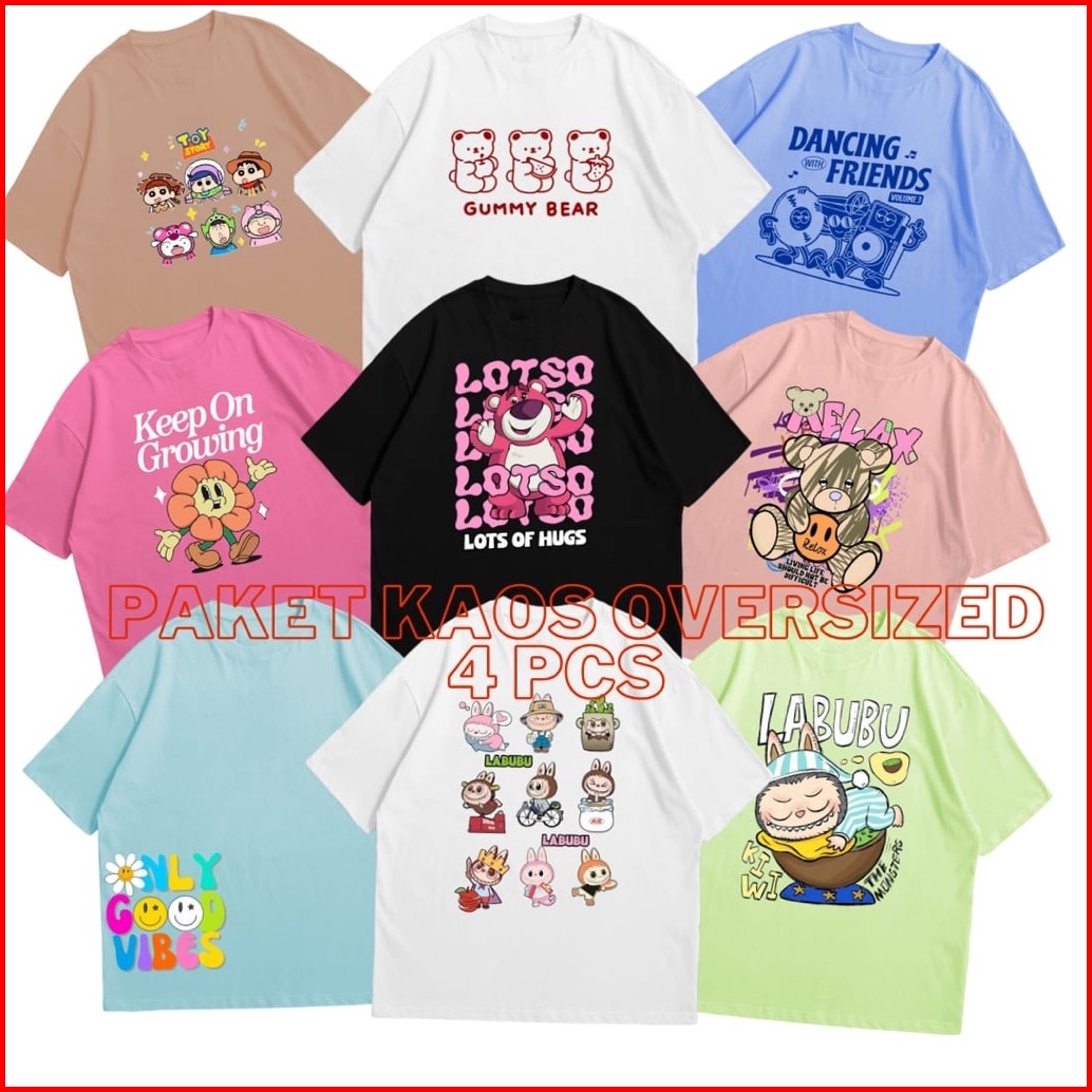 Mora Paket 4 Pcs Kaos Distro Wanita Dewasa Oversized Premium Cotton 24s