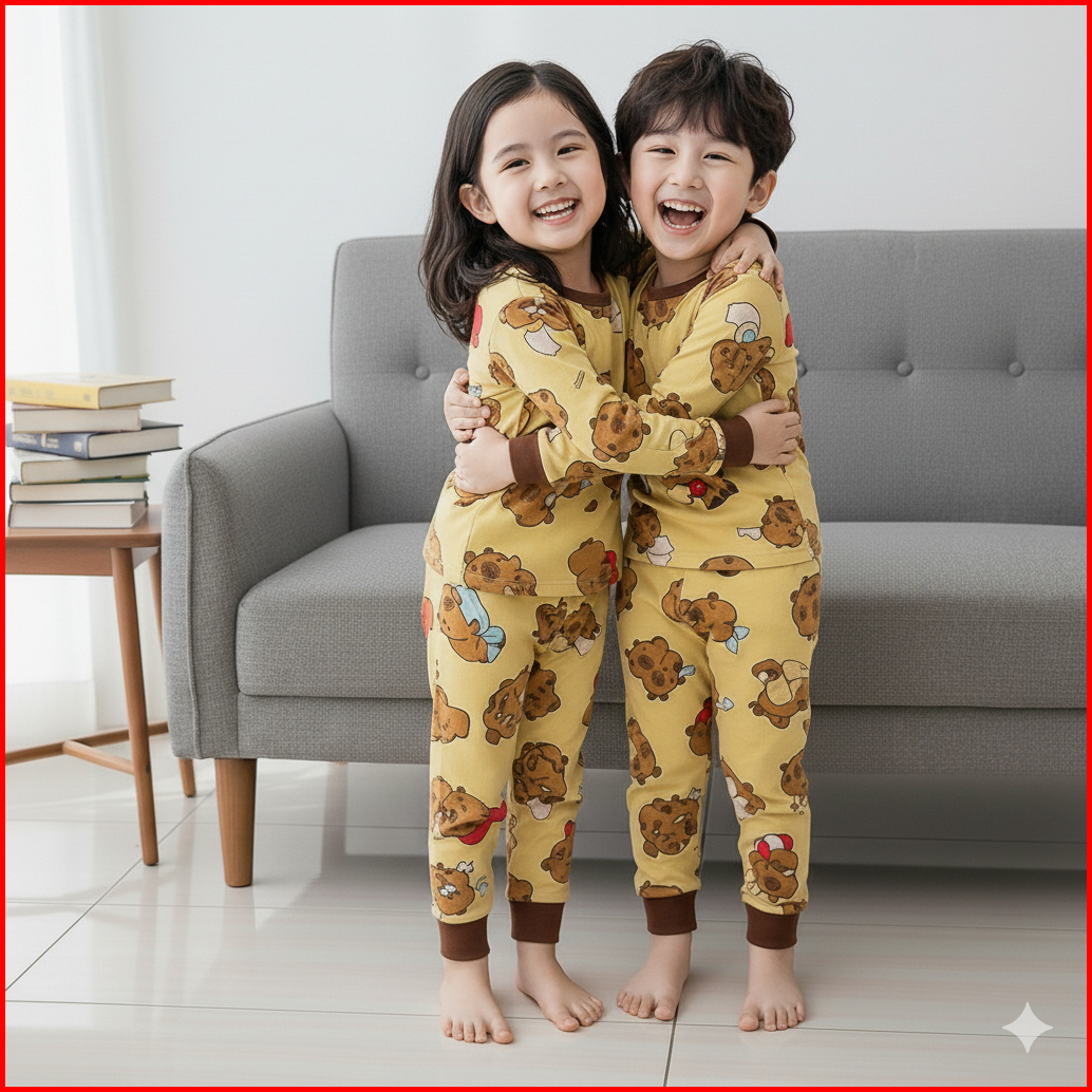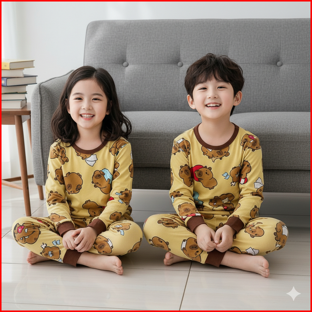 Dealshop Setelan Baju Tidur Anak Perempuan Dan Laki Laki Usia 1-10 Tahun Bahan Kaos Motif 379 Capybara Sleepy