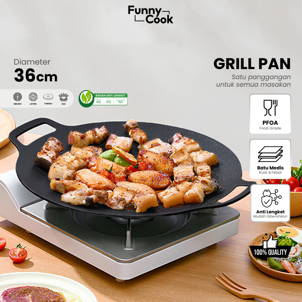 FUNNYCOOK Alat Panggang BBQ Grill Pan Korean 36CM 38CM Wajan Bulat Anti Lengket Serbaguna