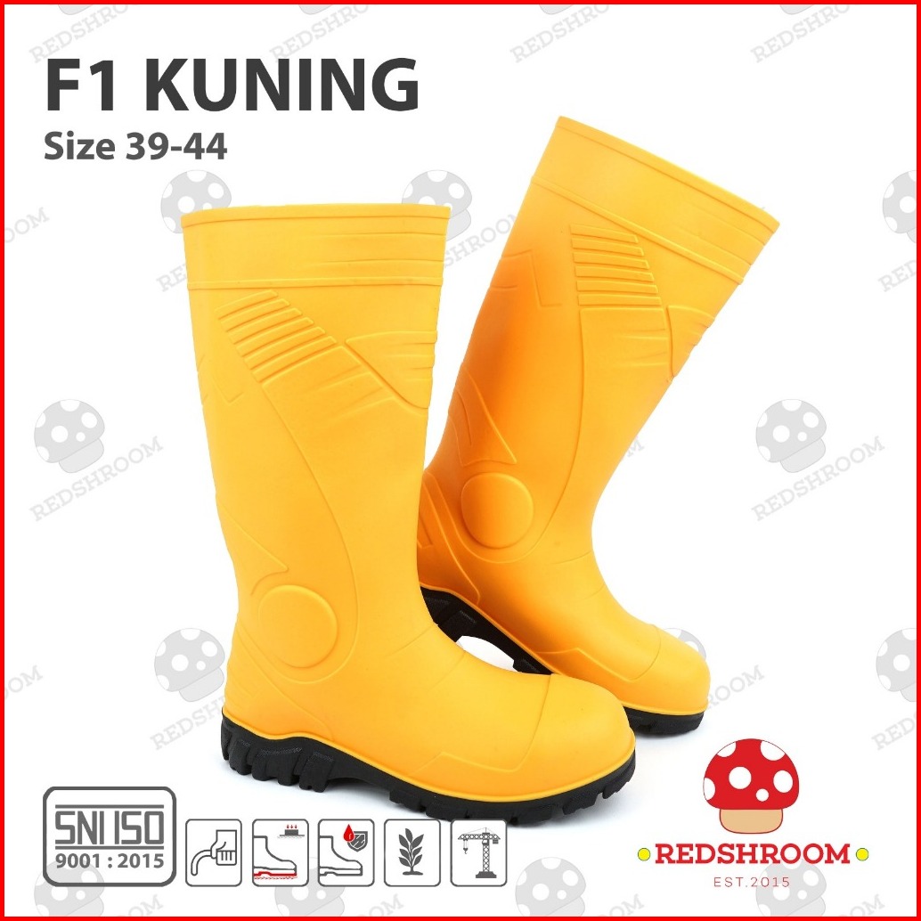 Sepatu Boot Tinggi F1 Safety Kuning Toe Cap Besi Anti Slip Air Karet Lokal
