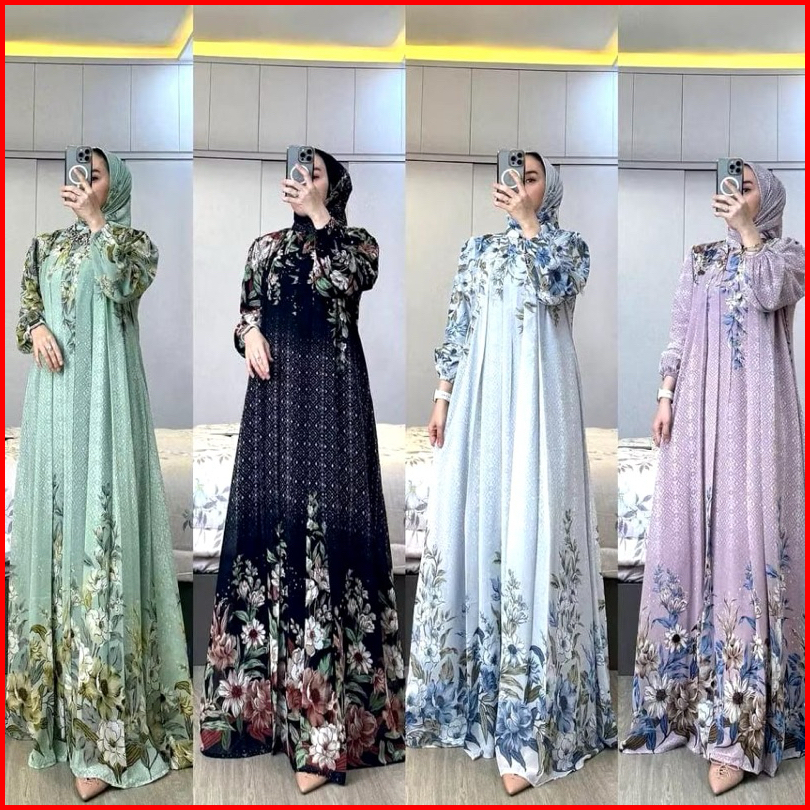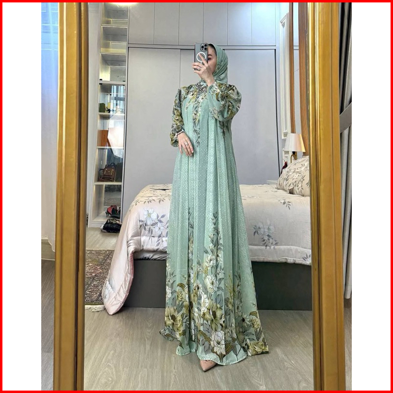 Gamis Set Hijab Wanita Motif Bunga Daun Etnik Rayon Diamond Premium Busui Friendly Dress Earth Tone Burgundy Gamis Lebar