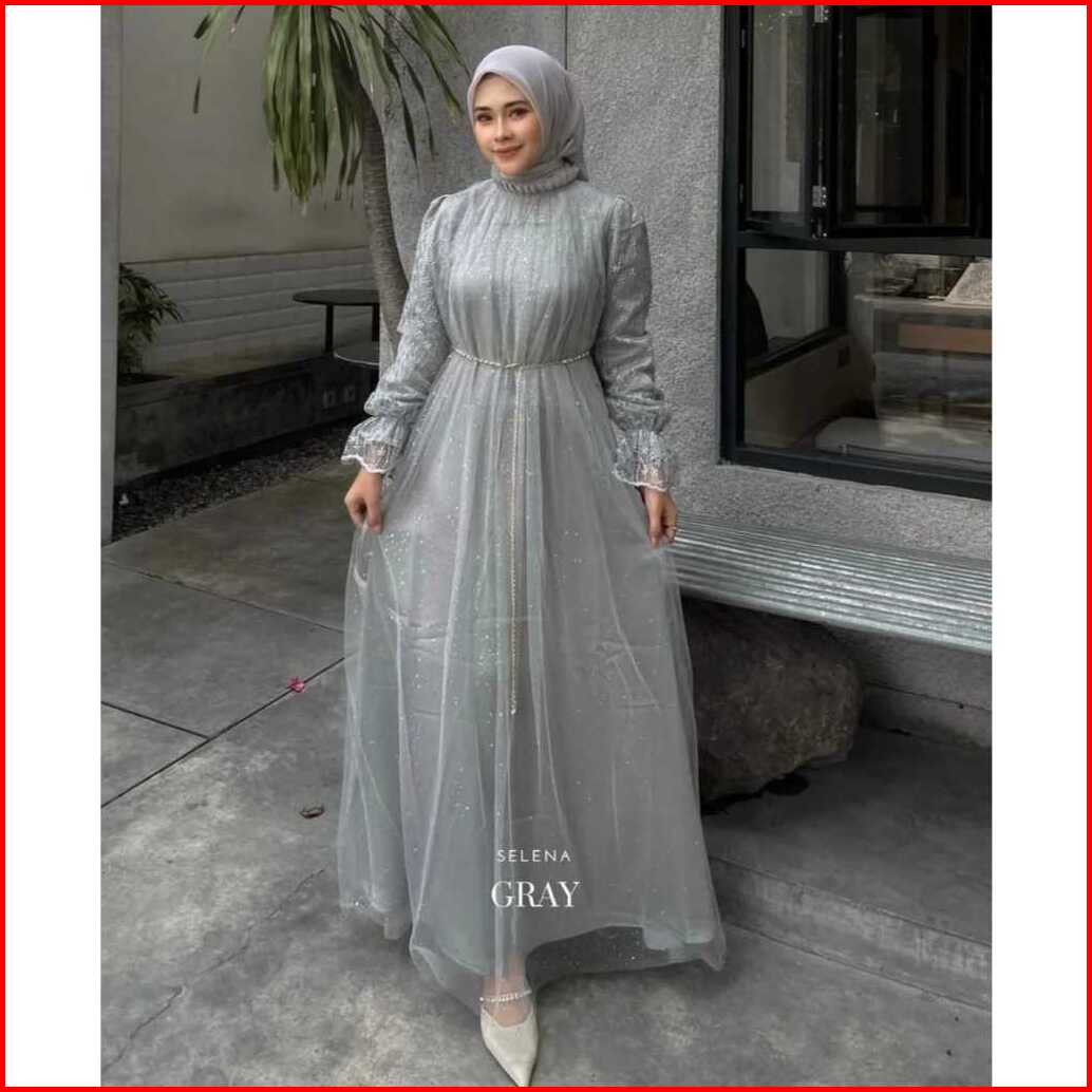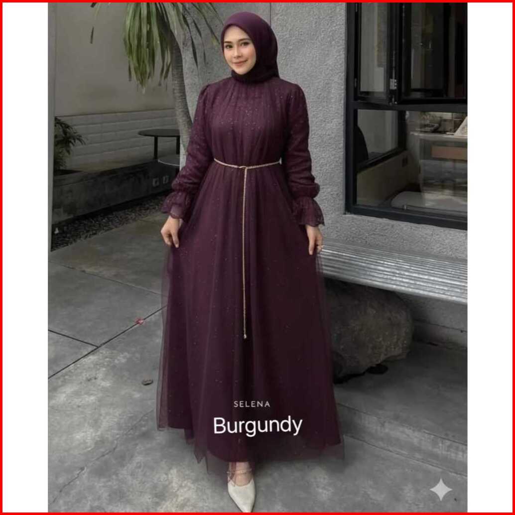 Selena Dress Gamis Mahogany Viral Terbaru Kekinian Bahan Silk Premium Mix Tille Aplikasi Brukat