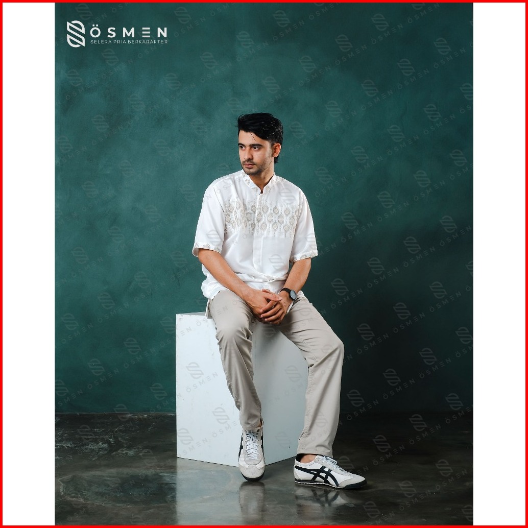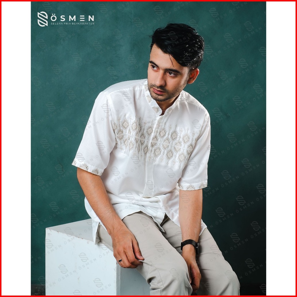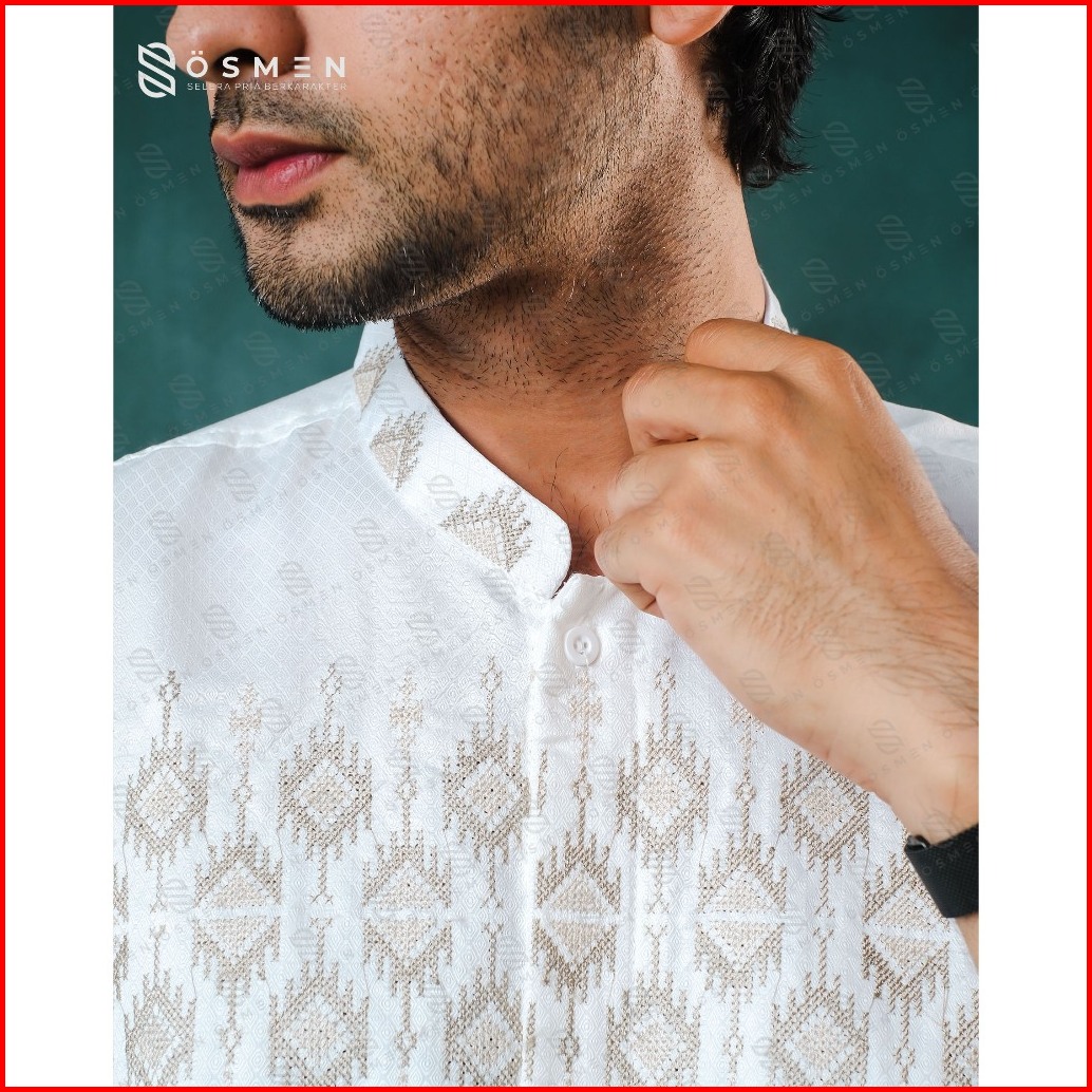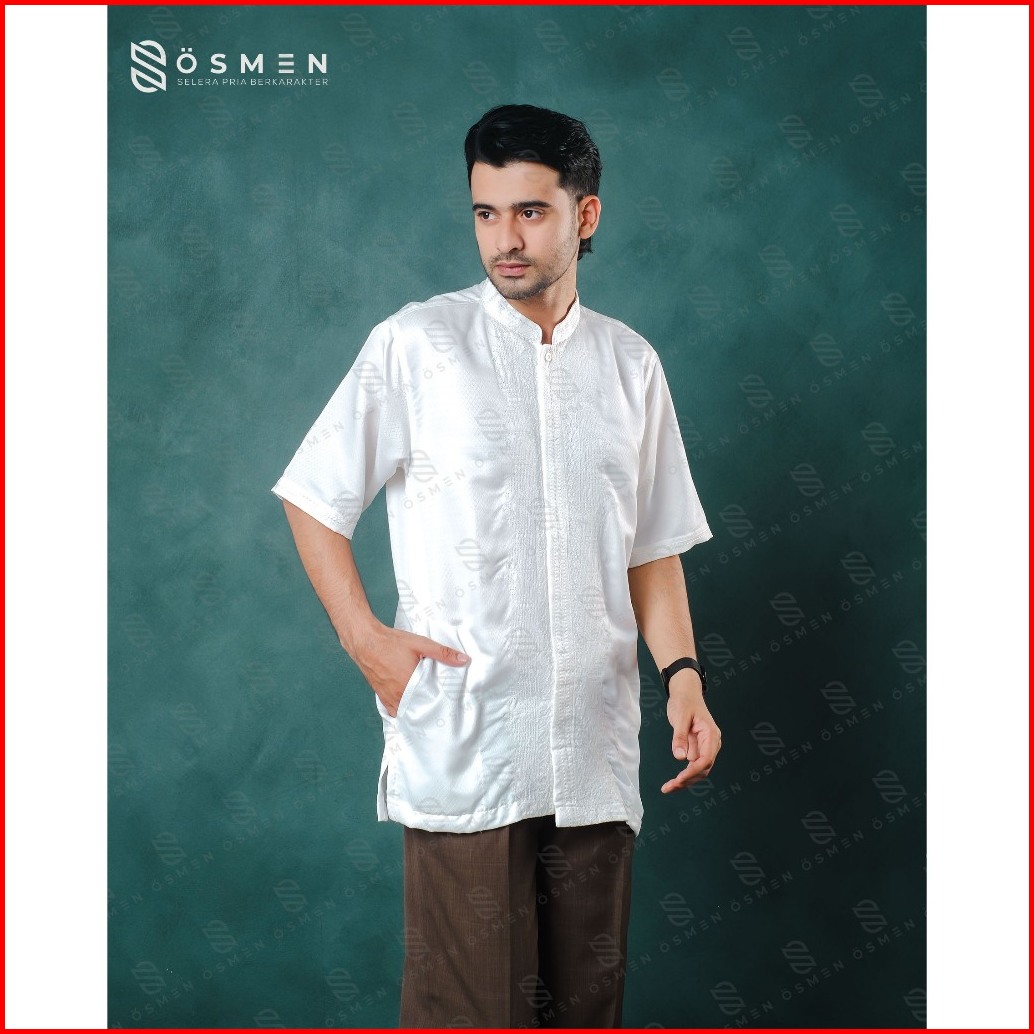 Baju Koko Pria Syakir Bordir Metalik Katun Braga Lengan Pendek Bersaku Muslim Lebaran - Osmen