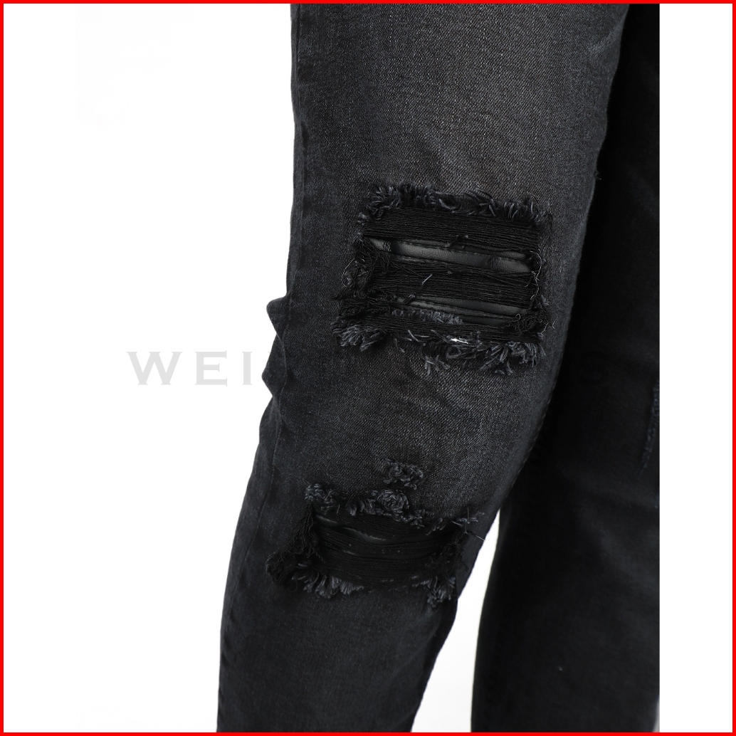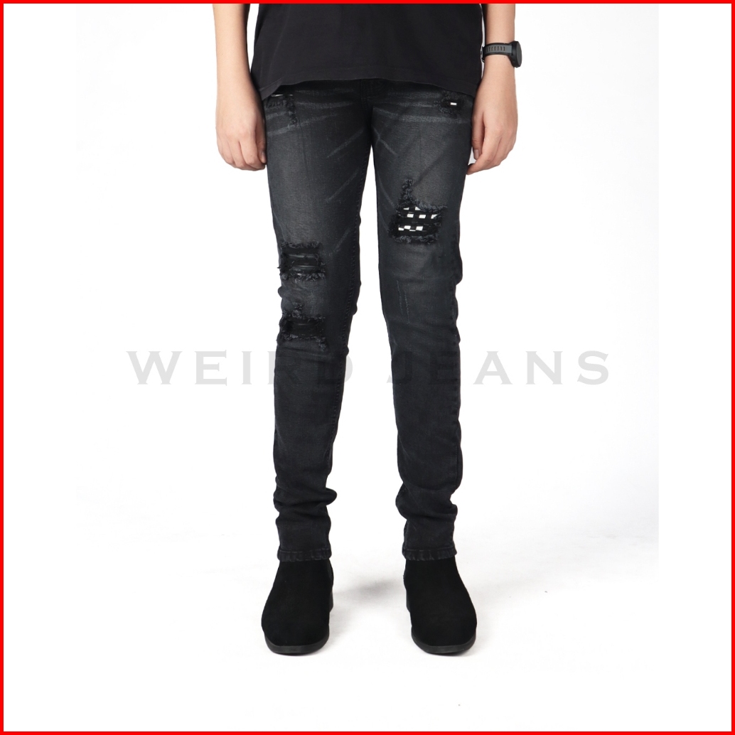 Weird Jeans - Hugo Black - Celana Jeans Panjang Denim Pria Slim Fit Warna Hitam Ripped Tambal Leather