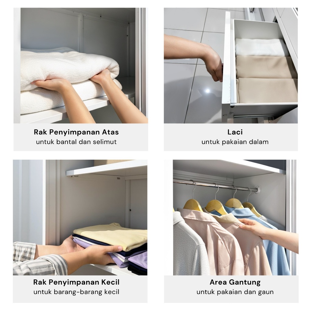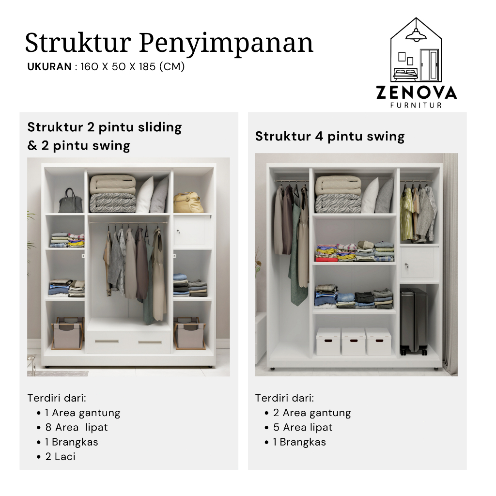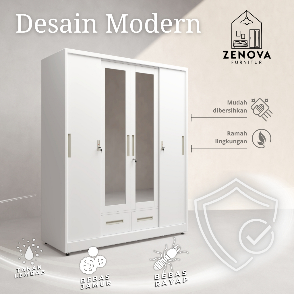 ZENOVA Official Lemari Pakaian Besi 160 Cm 4 Pintu Sliding 1 Hanger 2 Laci Cermin Minimalis