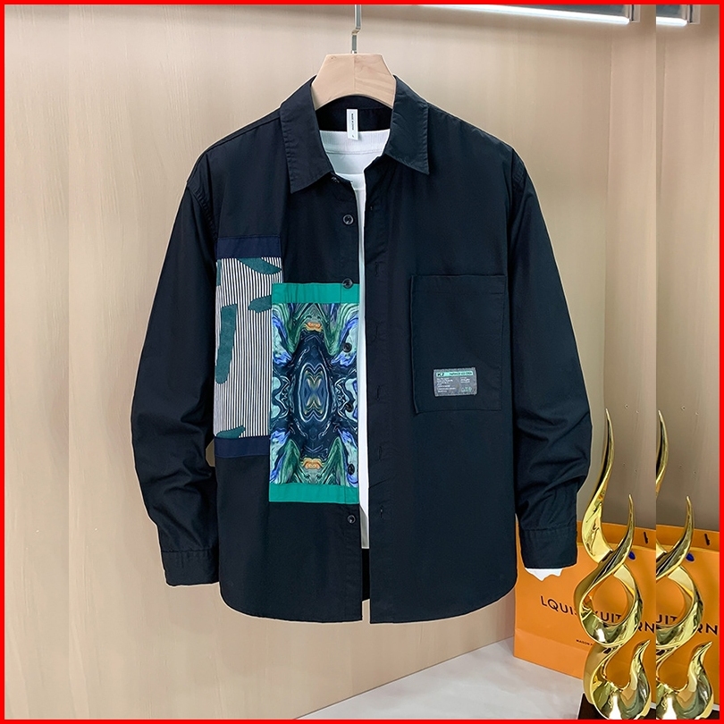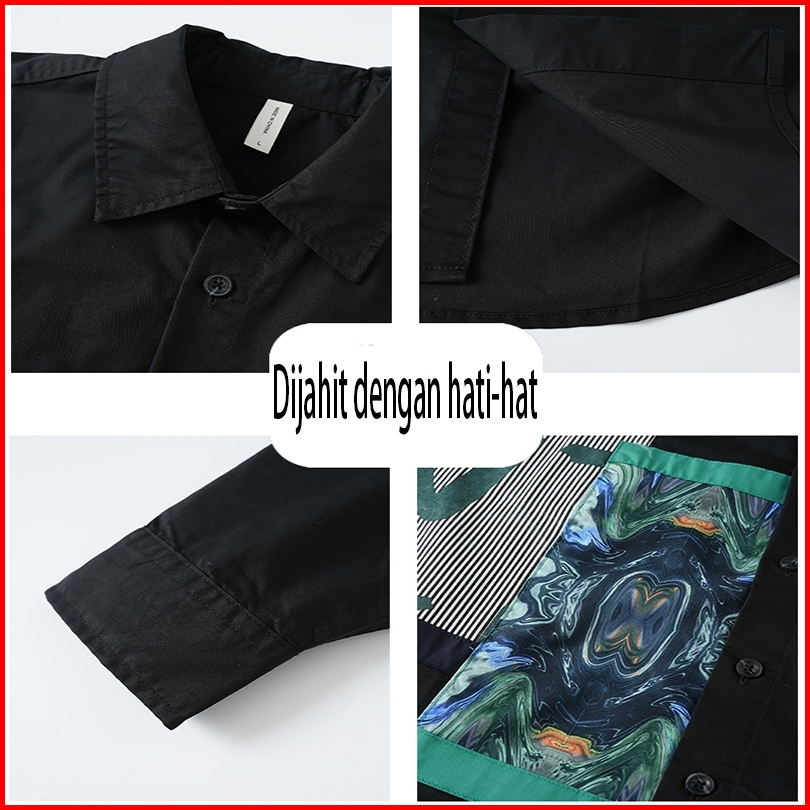 Medivh Men S Hitam Shirt Abstract Pattern Print Long Sleeve Fashion Trendy Patchwork Korean Baju Ice Silk Pria