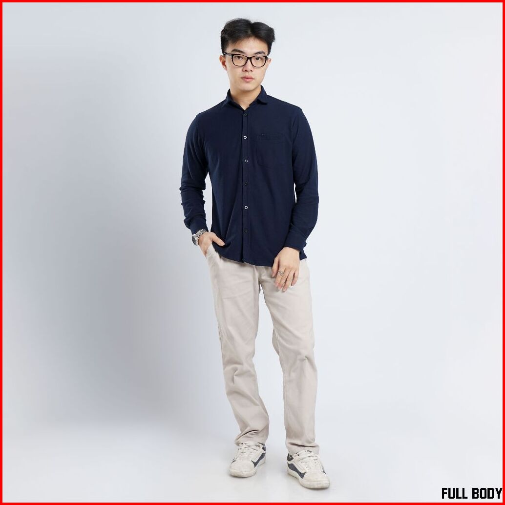 Yomen Kemeja Polos Pria Pique Lengan Panjang Navy