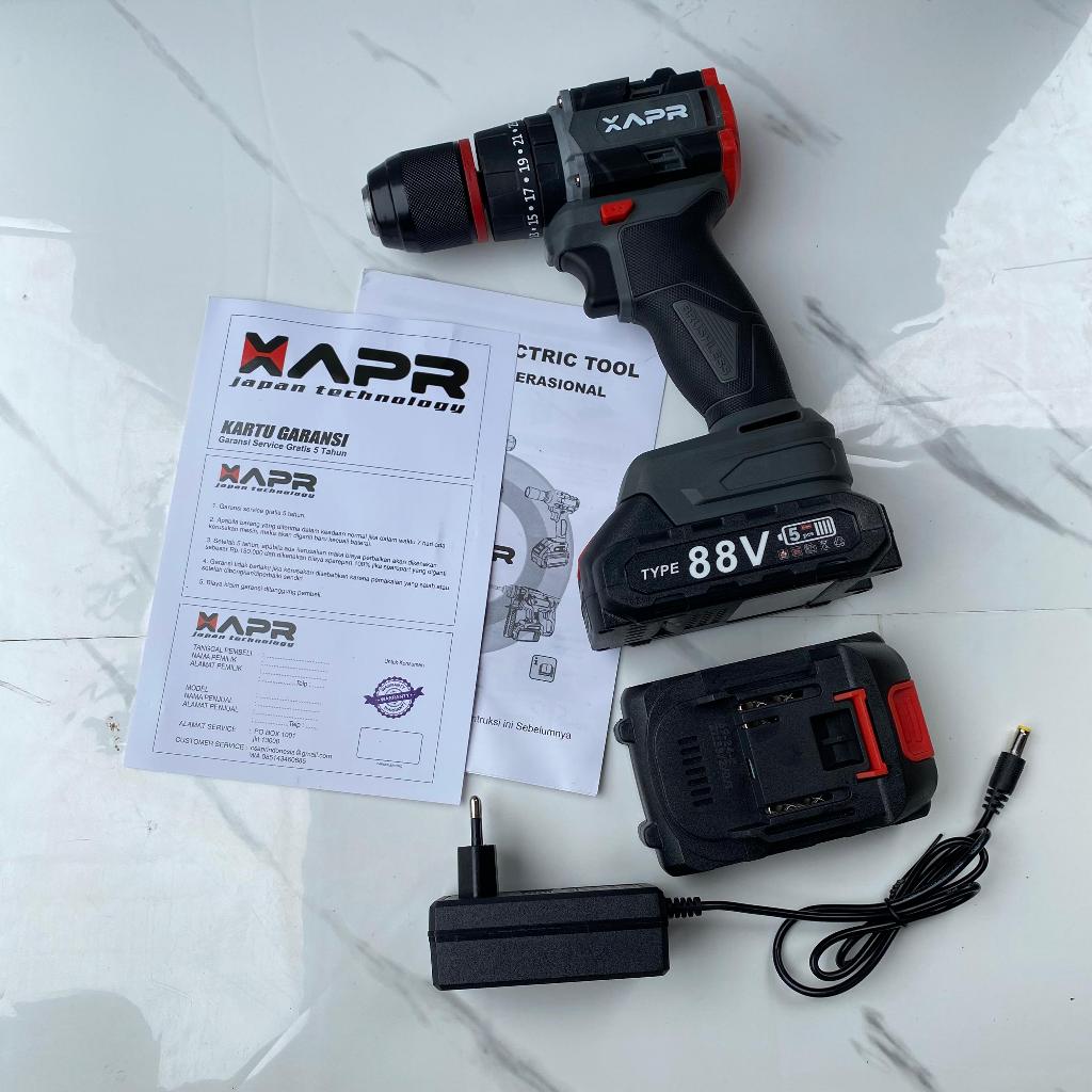 APR BOR impact drill BRUSHLESS TYPE AP34+ 13mm keyless auto lock 2baterai lxt 88v GARANSI 5 TAHUN
