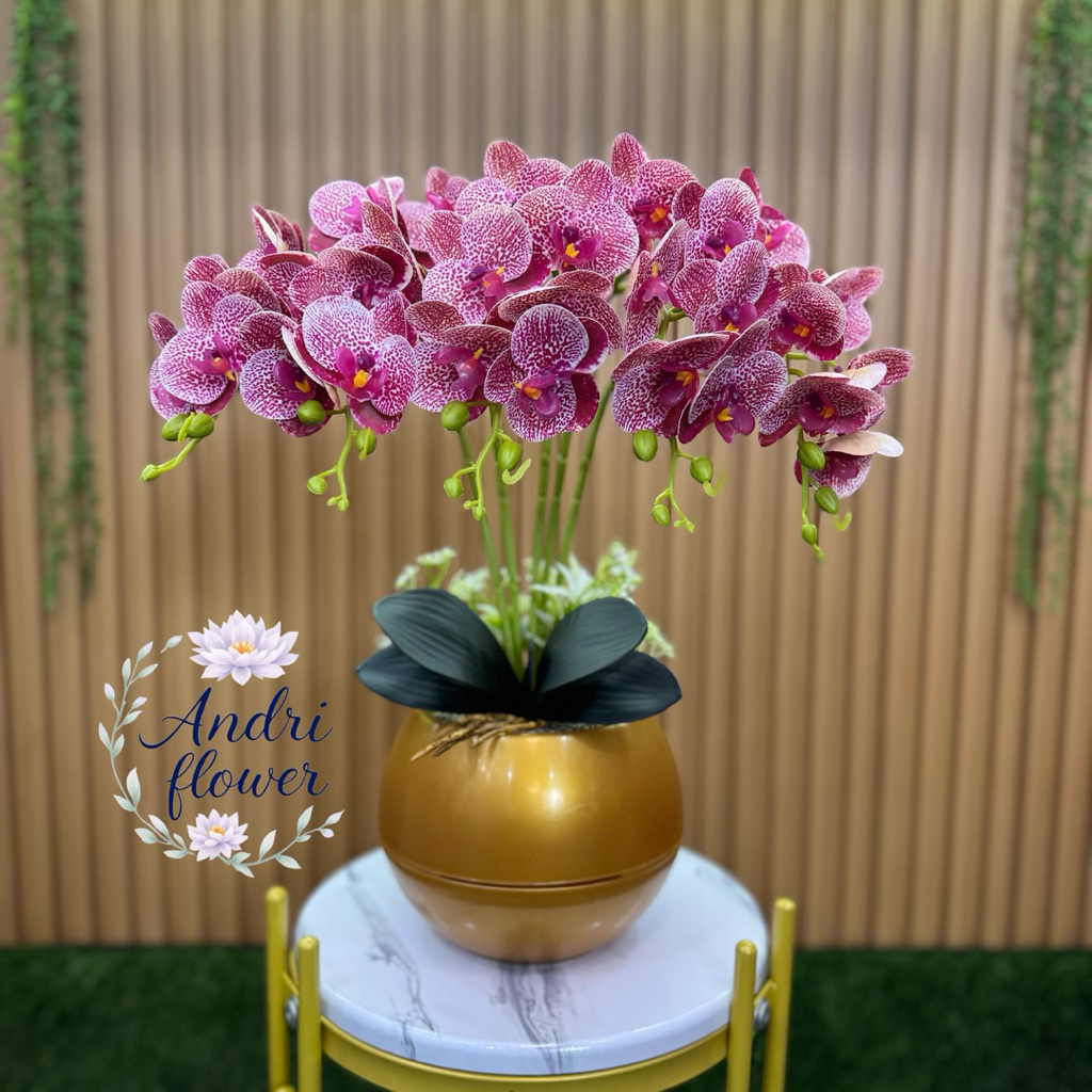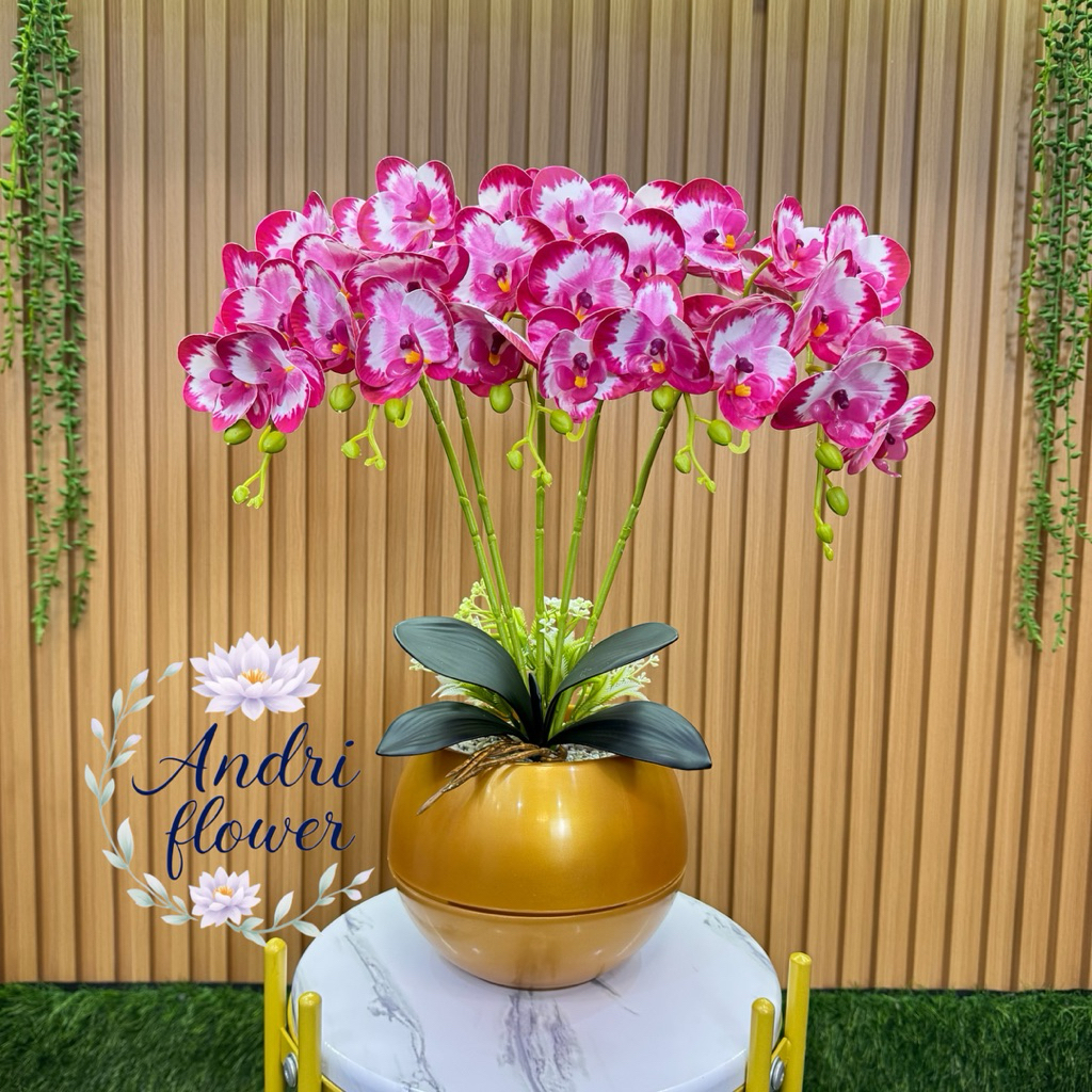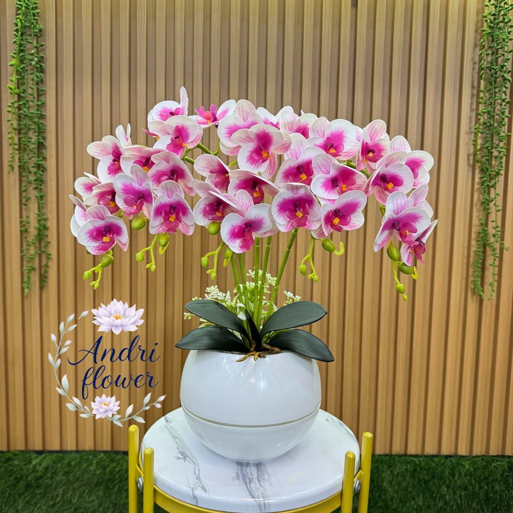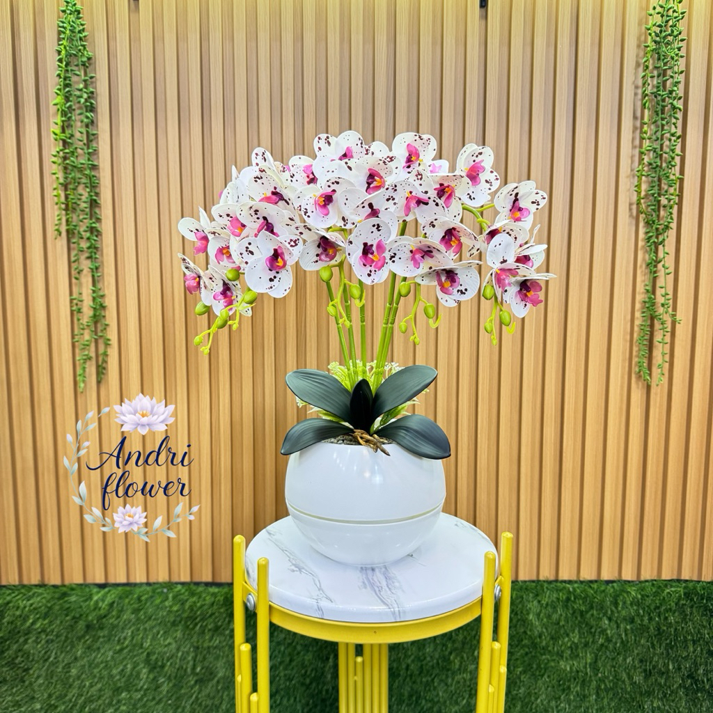 BUNGA HIAS ANGREK LATEK 5 CABANG 35 KUNTUM BUNGA DENGAN VAS BOLA BUNGA ARTIFICIAL