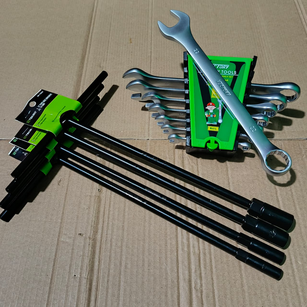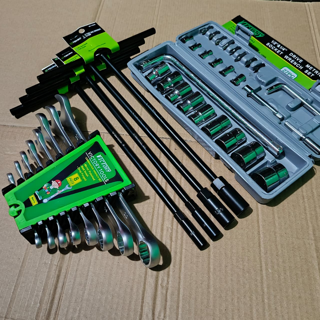 Paket Alat Benkel 3 Set Tekiro Kunci T 4 pcs 8-10-12-14 mm + Kunci Sok Set 27 Pcs + Kunci Ring Pas Set 8 Pcs 6-22mm VICTORY