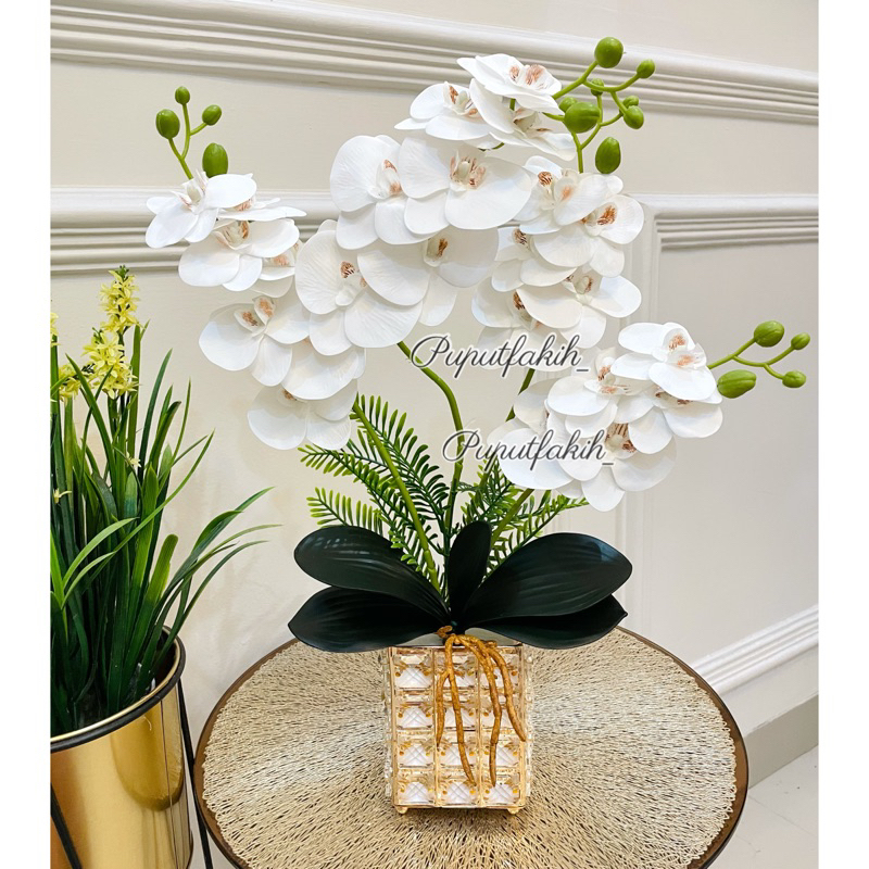 Vas Crystal dengan bunga anggrek latex 2 tangkai daun rimbun vaskuningan mengkilap anggrek sudah di rangkai