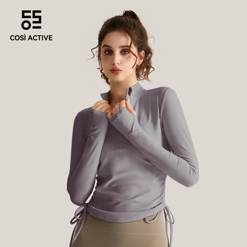 COSI ACTIVE Baju olahraga wanita lengan panjang dengan desain ritsleting dan lipatan samping