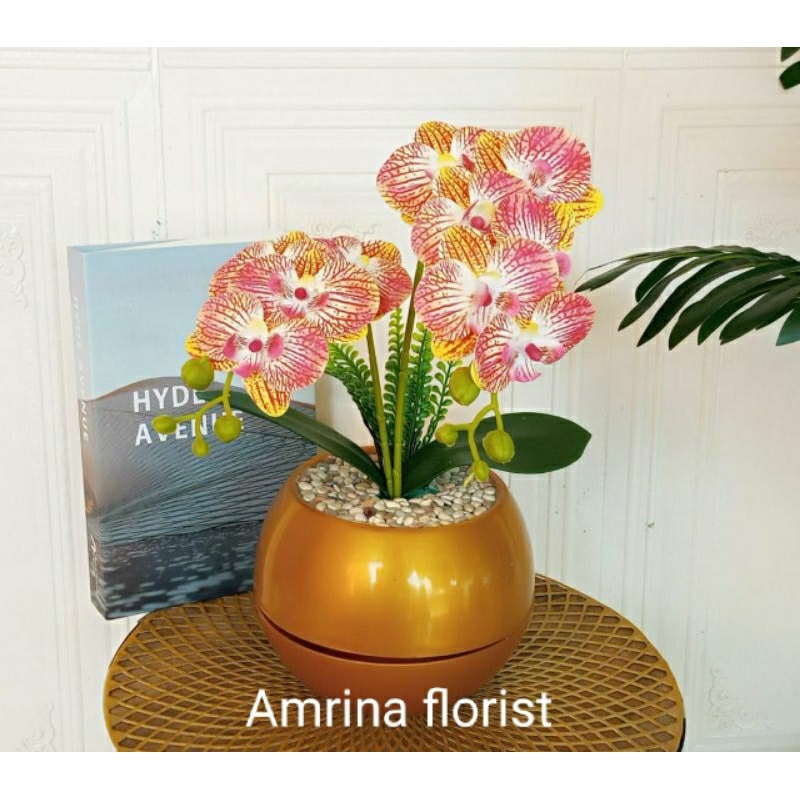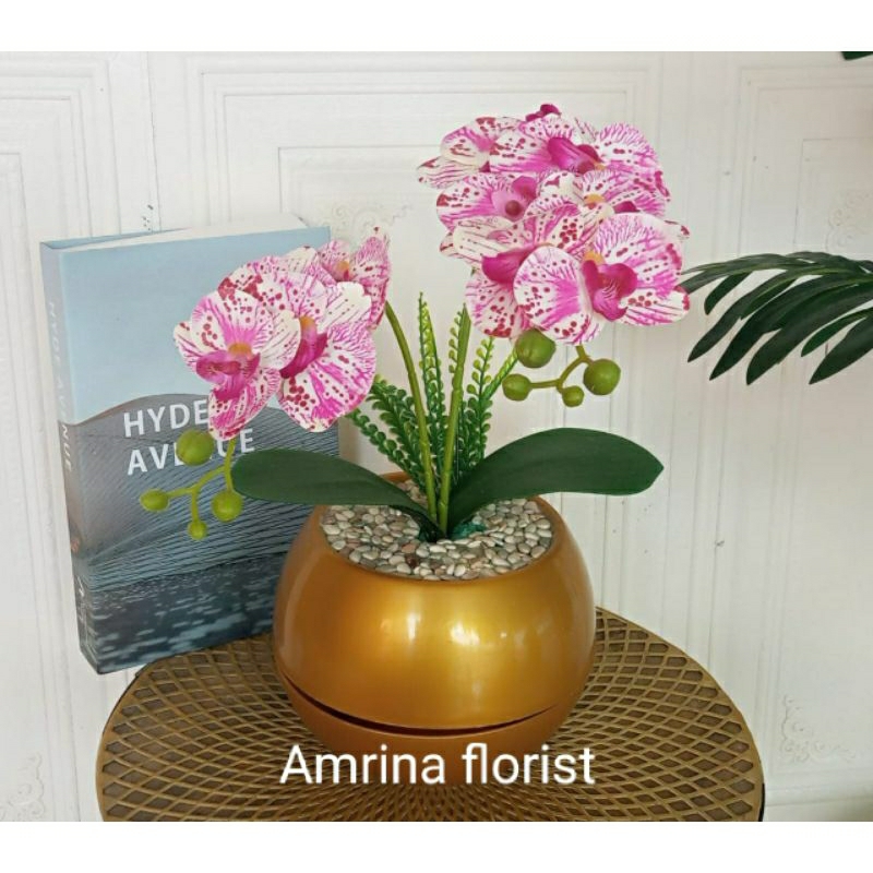 Bunga anggrek latex artificial 2 cabang vas kuningan mengkilap