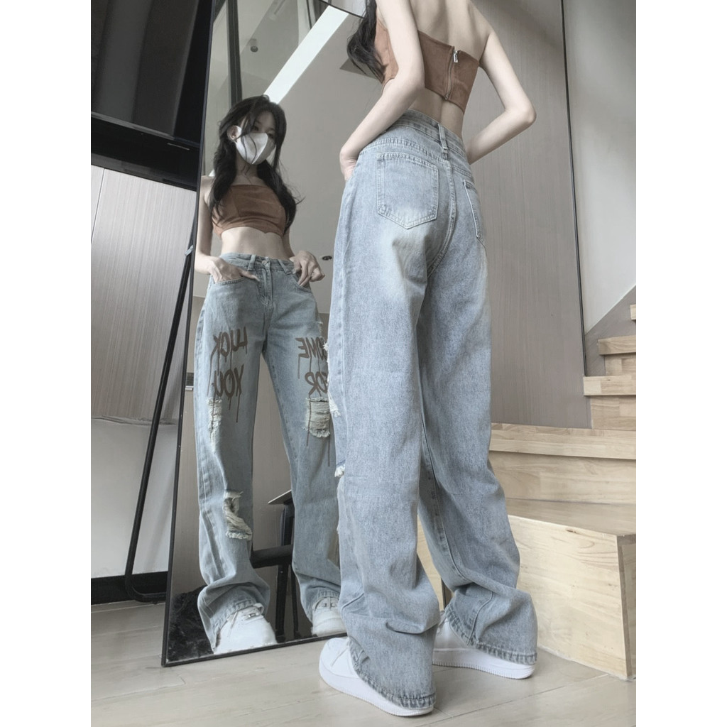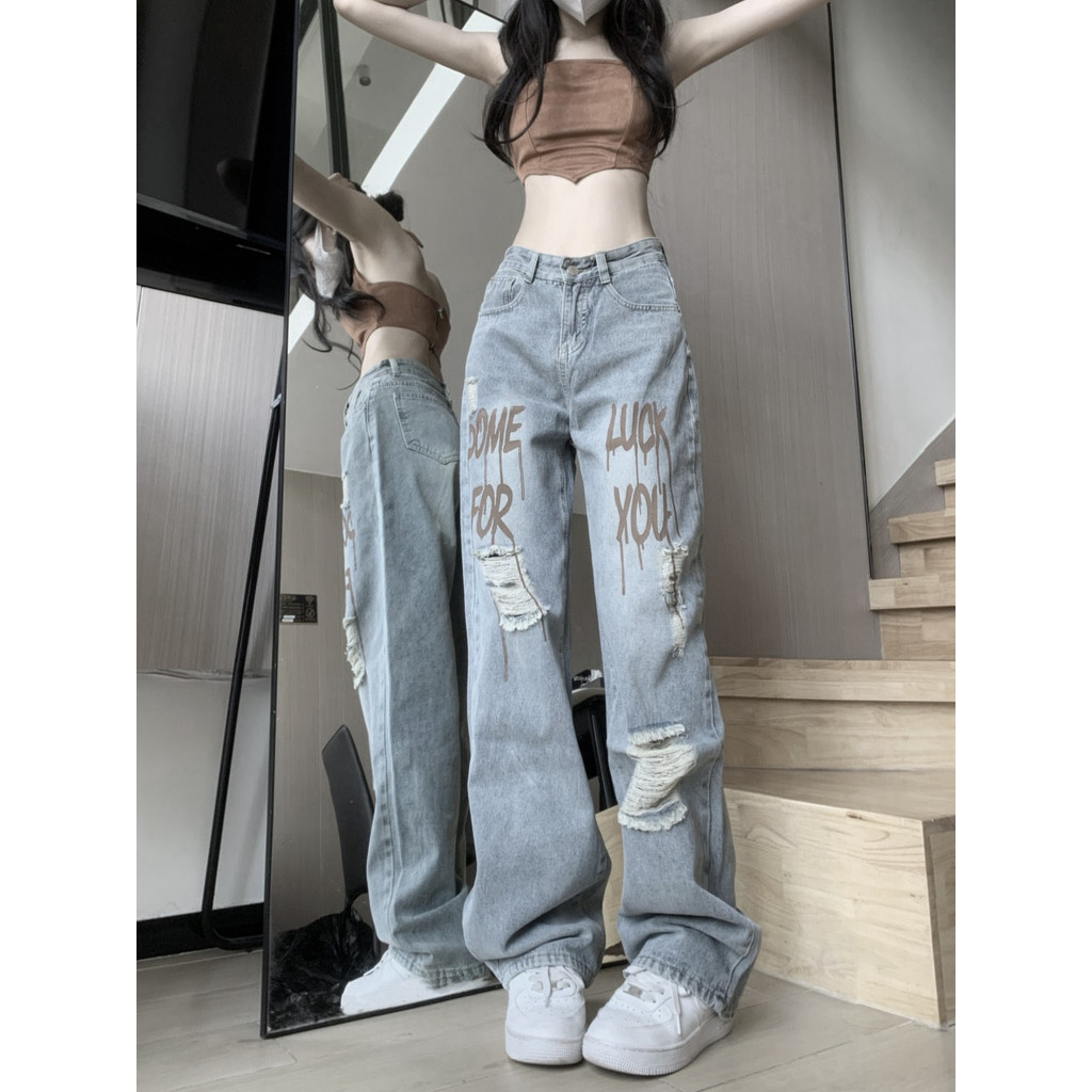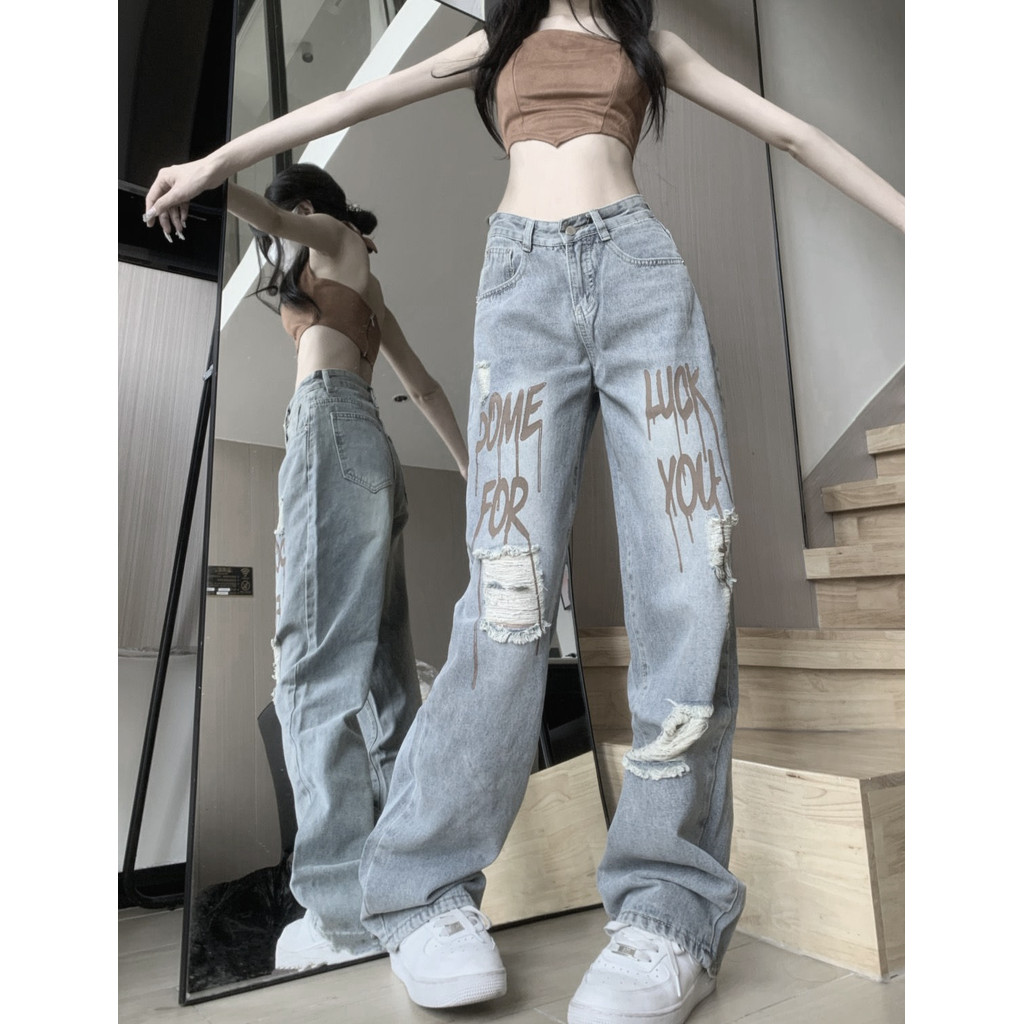 Celana Jeans Robek Retro Pinggang Tinggi Wanita Korea Terbaru Celana Jeans Longgar Kasual Hip-hop