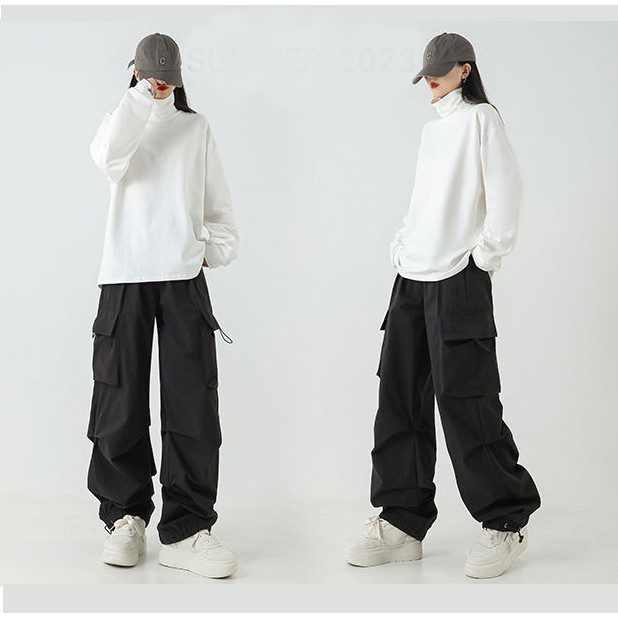 Celana Cargo Retro Wanita Celana Kasual Longgar Pinggang Tinggi Gaya Korea Celana Olahraga Banyak Saku