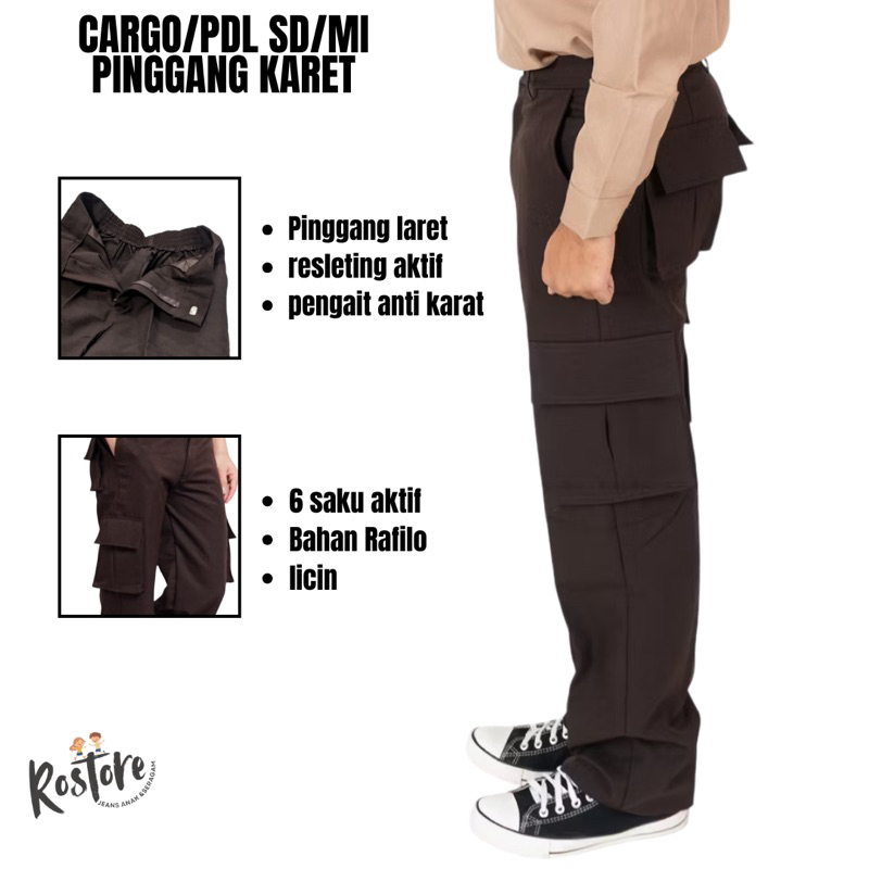 Seragam Sekolah Celana Pramuka PDL Kempol Cargo Saku 6 SD Karet Pinggang Bahan Rafilo