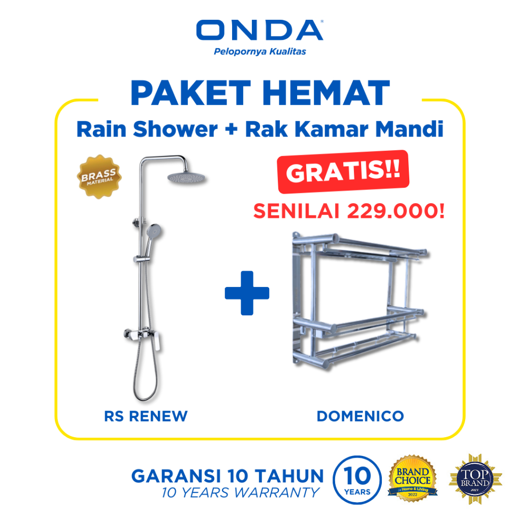 ONDA PAKET HEMAT Rain Shower Tiang RS RENEW + FREE Rak Kamar Mandi Double Anti Karat DOMENICO