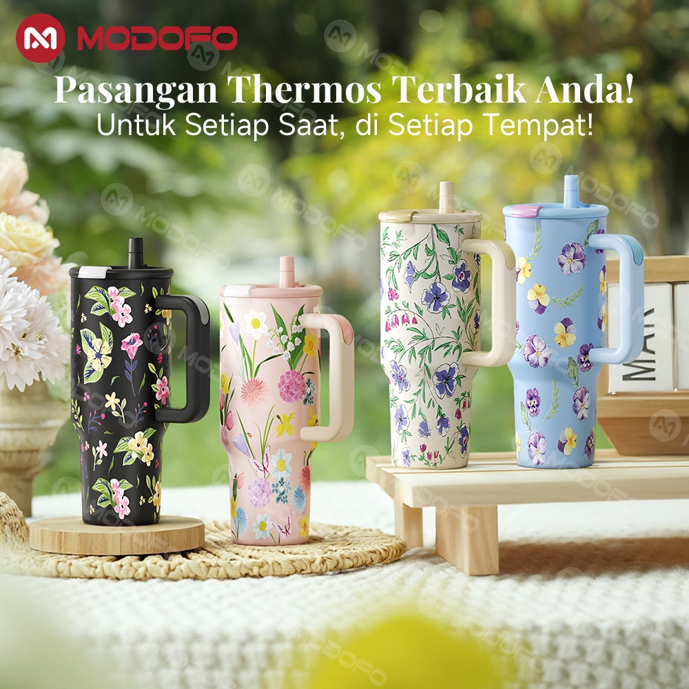 MODOFO Tumbler Stainless 1200ml Sedotan Botol Minum Aesthetic Tahan Panas Dingin 24 Jam Motif Tanaman Hias Anti Tumpah